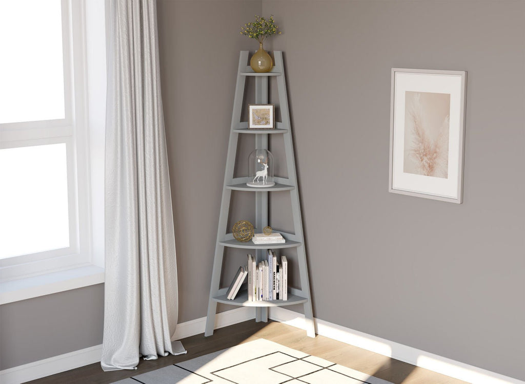 Maximize corner space with this elegant Corner Bookshelf in a soft light grey finish. Featuring five spacious tiers and decorative borders, it offers both practical storage and refined style. Perfect for displaying books, plants, décor, or collectibles, the triangular corner design fits snugly into unused spaces while adding a modern, Scandinavian-inspired touch to any room. Durable and easy to assemble, this shelf brings organized charm to living rooms, bedrooms, home offices, or entryways.