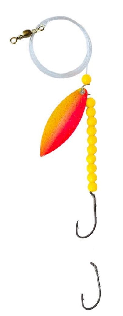 This Willow Leaf Spinner features a vivid Pink Wave blade paired with solid yellow beads for a bright, high-visibility presentation that stands out in clear or stained water. The wave pattern creates a dynamic flash, while the slim willow blade allows for fast retrieves and a tight, fluttering action. Designed to attract bass, trout, walleye, and panfish, this spinner excels when fish are feeding aggressively or in need of a color trigger.