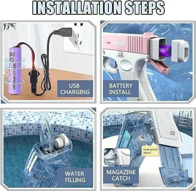 Keep the summer fun going with this Electric Automatic Water Gun by Kabeila. Featuring a one-button firing and magazine change system, it delivers long-lasting play with a rechargeable battery providing up to 50 minutes of continuous use. With dual water tanks (434CC + 58CC) and a shooting range up to 32 feet, this high-performance water gun is perfect for pool, beach, backyard battles, or outdoor family fun. Safe, durable, and leakproof, it’s designed for kids ages 4–12 to enjoy endless summer water adventures.