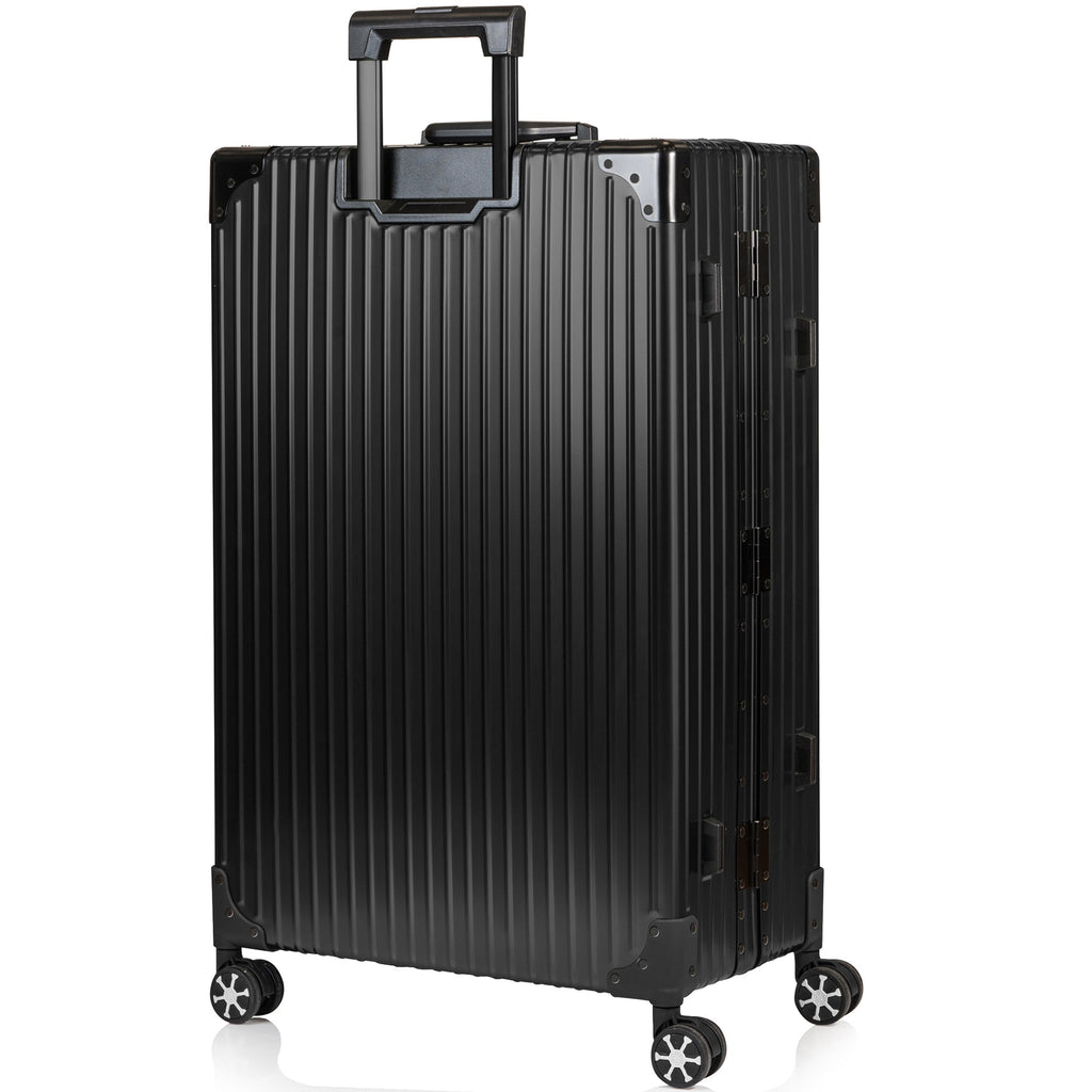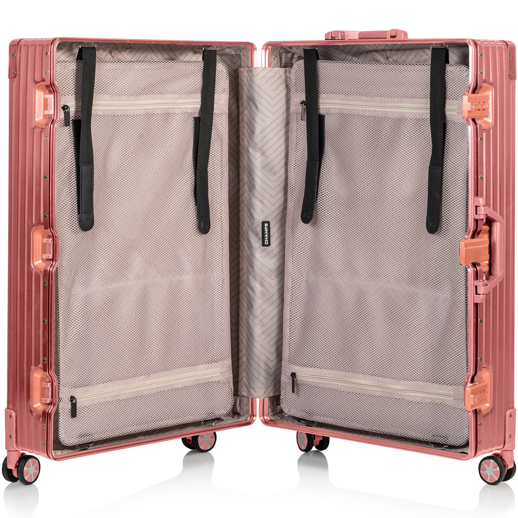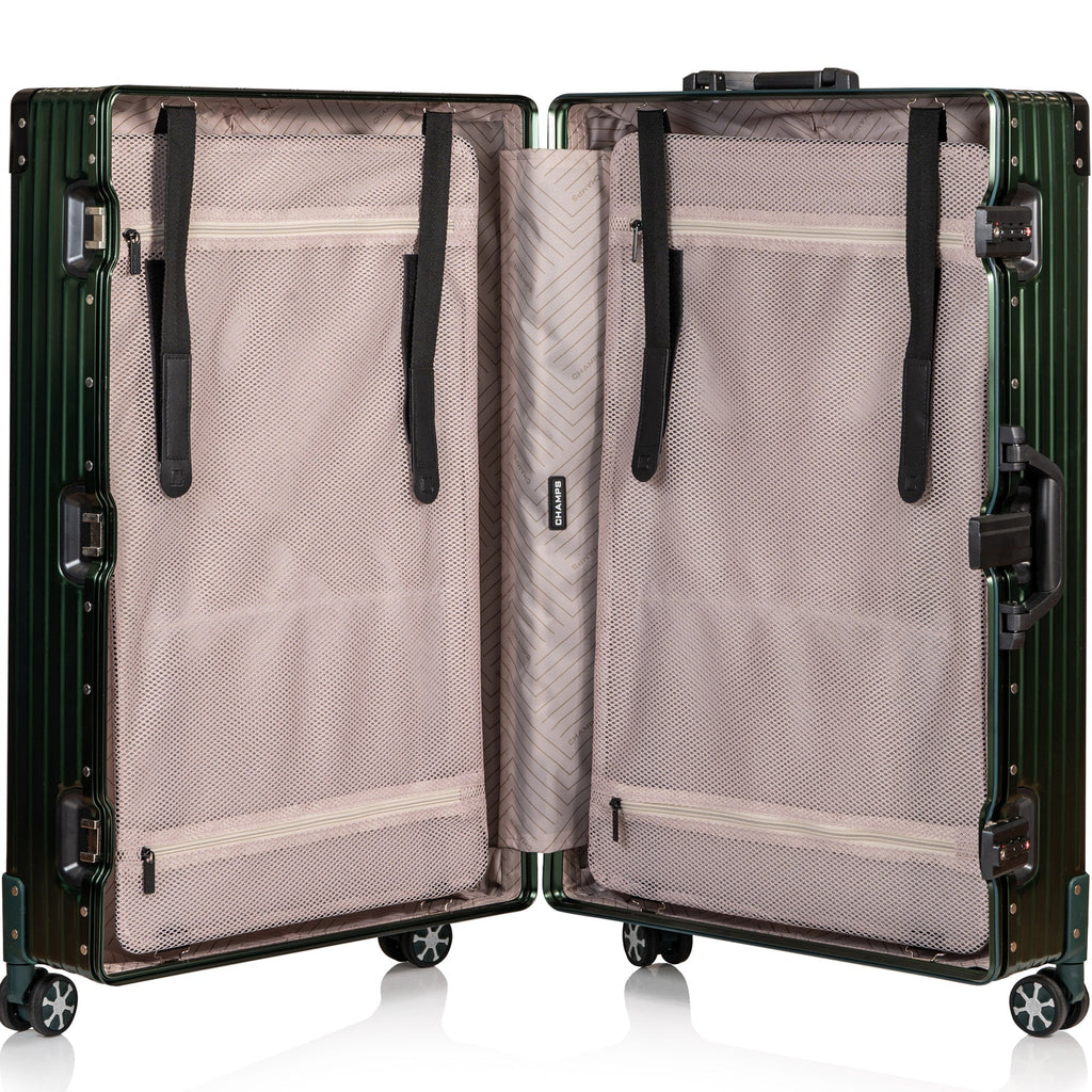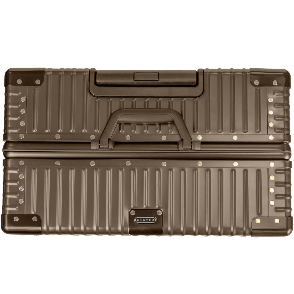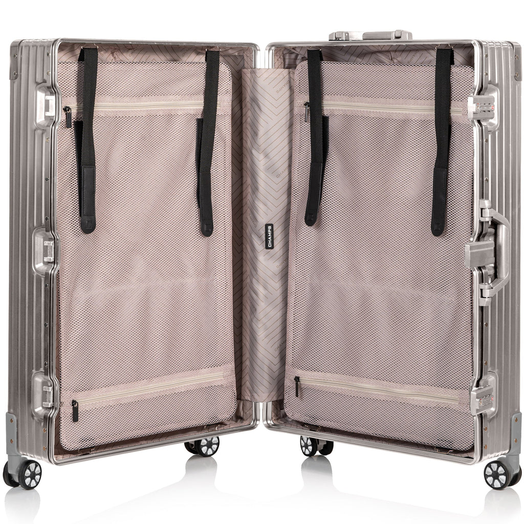 The Elite Collection Aluminum Large Check-in from Champs combines durability, sophistication, and security. Crafted from premium aluminum, it features dual TSA-approved combination locks, 360-degree spinner wheels, a telescopic handle, and interior organizational compartments—perfect for extended vacations or business trips.