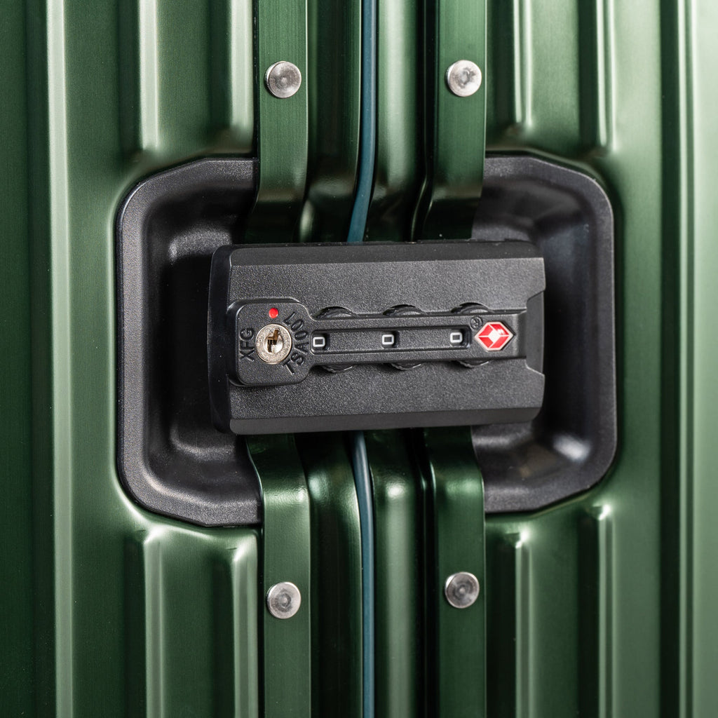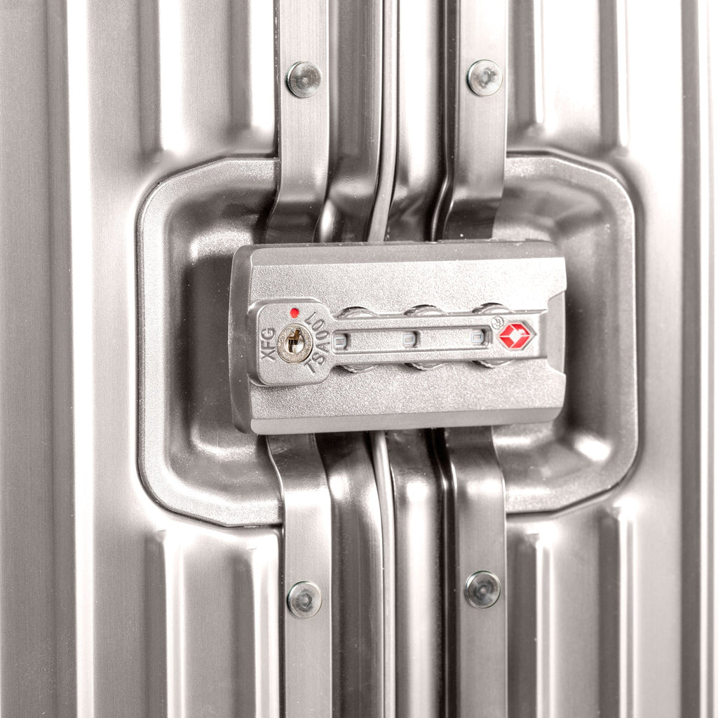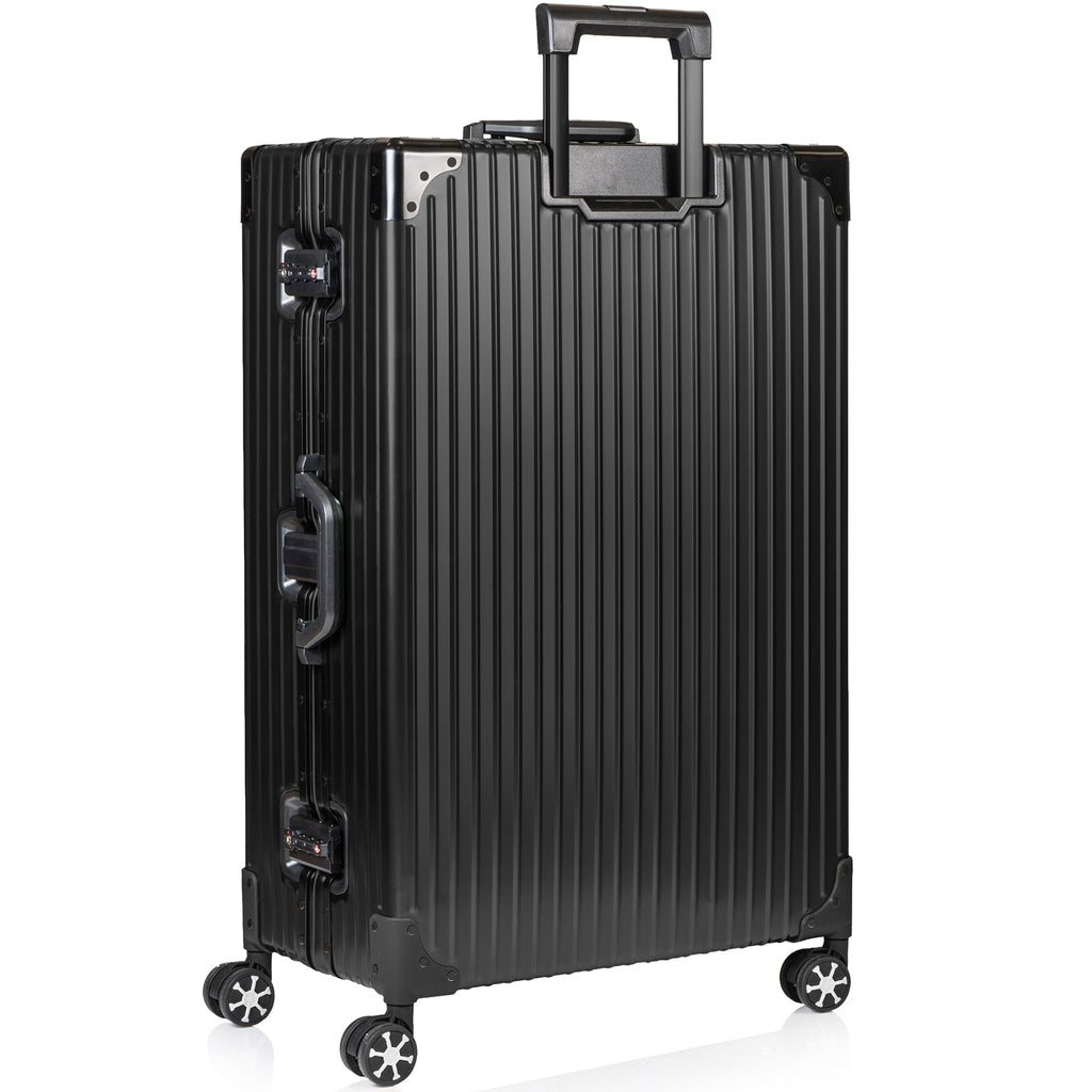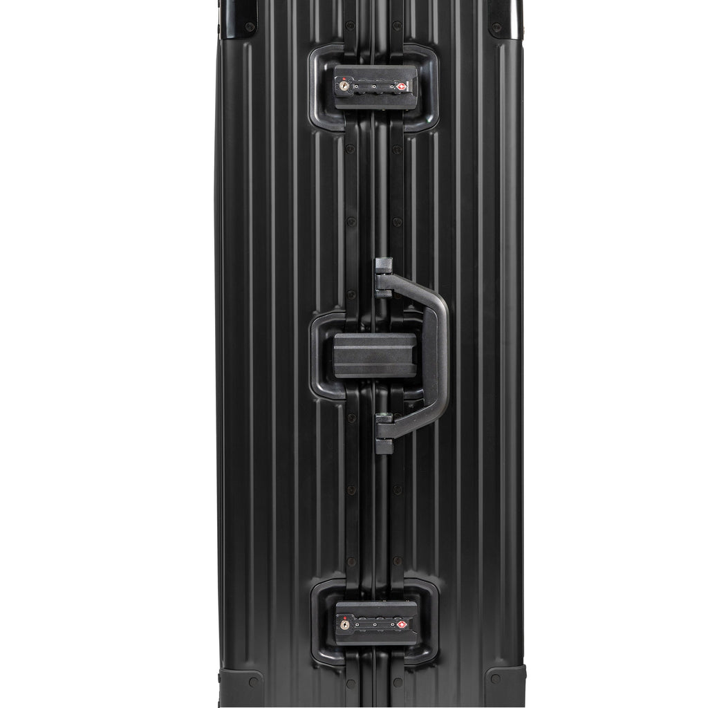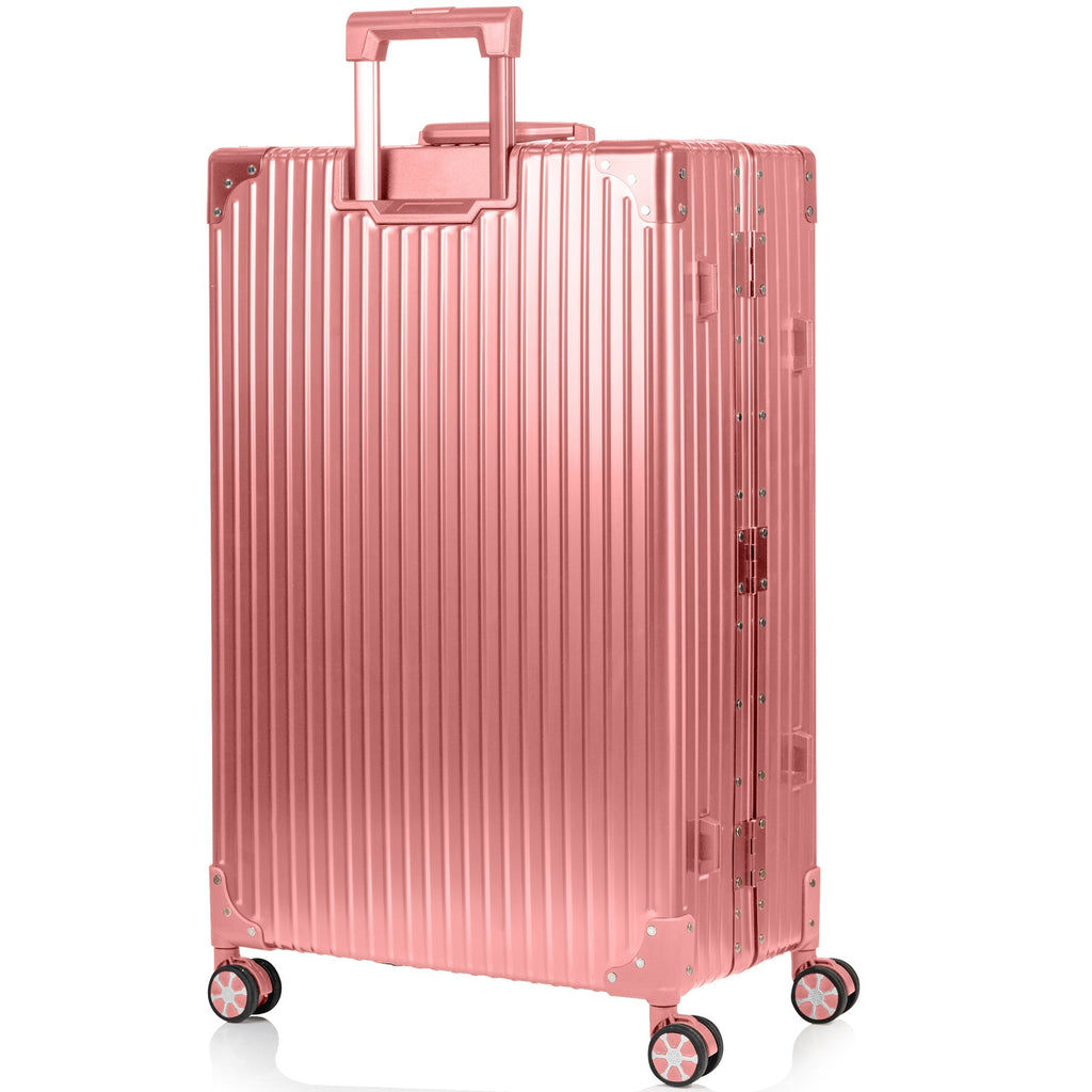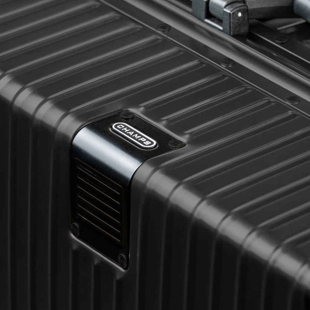 The Elite Collection Aluminum Large Check-in from Champs combines durability, sophistication, and security. Crafted from premium aluminum, it features dual TSA-approved combination locks, 360-degree spinner wheels, a telescopic handle, and interior organizational compartments—perfect for extended vacations or business trips.