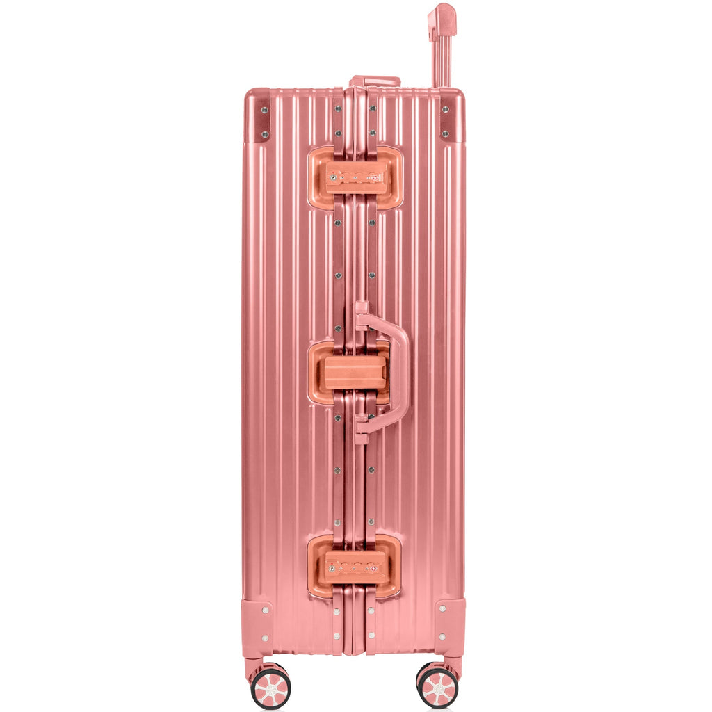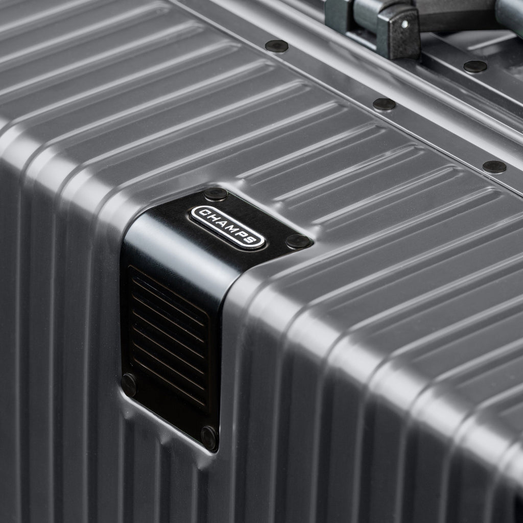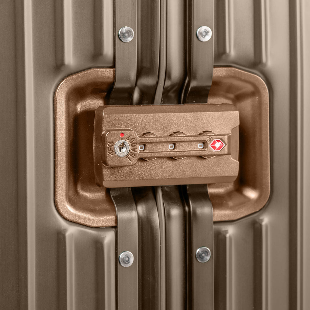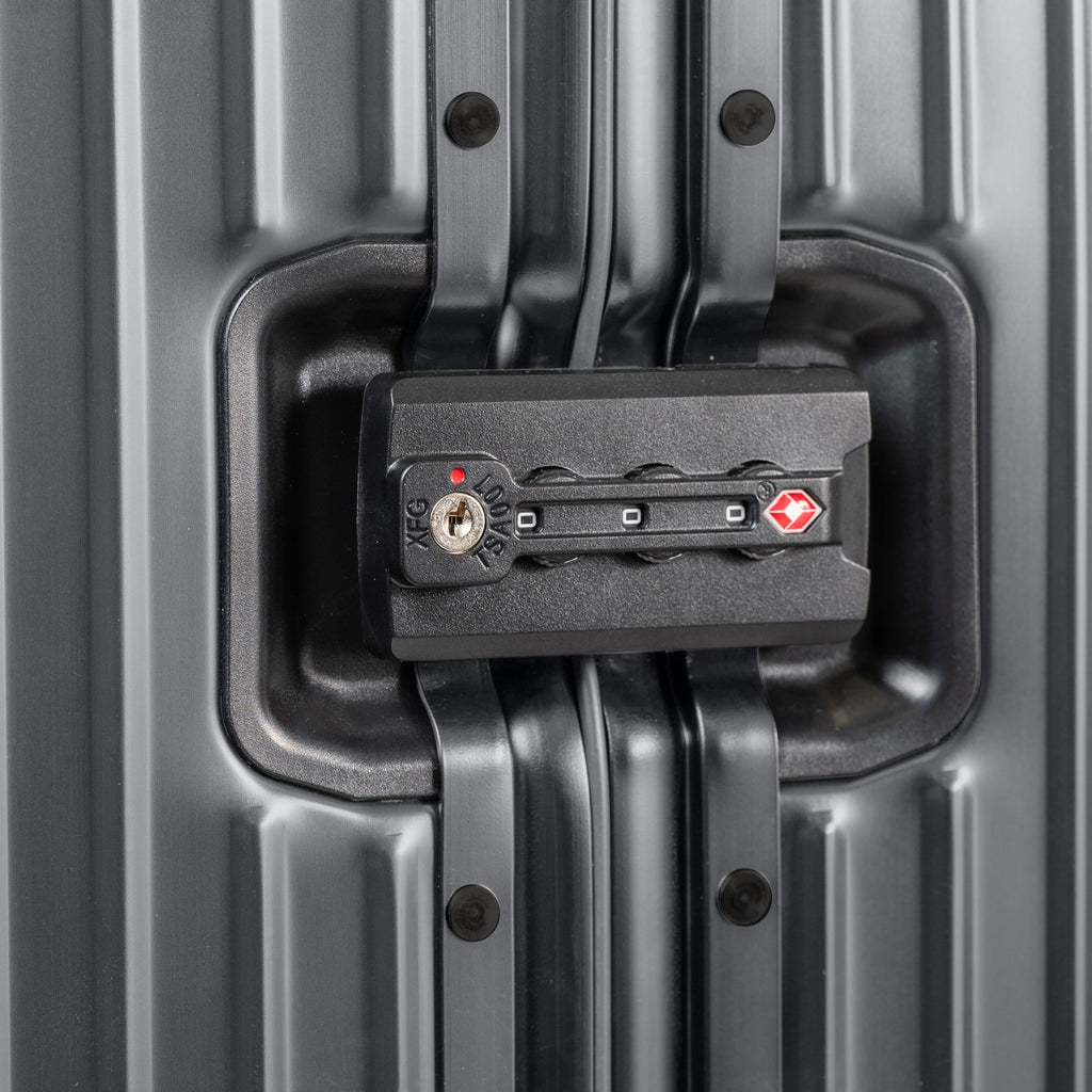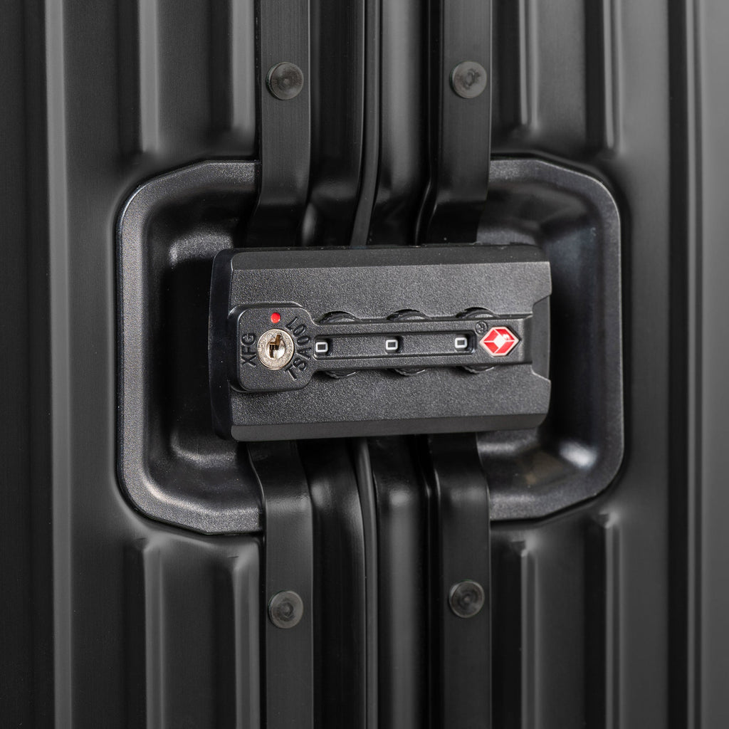 The Elite Collection Aluminum Large Check-in from Champs combines durability, sophistication, and security. Crafted from premium aluminum, it features dual TSA-approved combination locks, 360-degree spinner wheels, a telescopic handle, and interior organizational compartments—perfect for extended vacations or business trips.