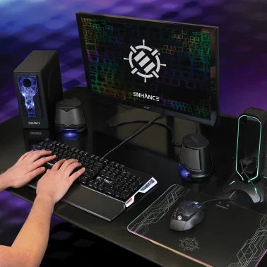 The ENHANCE SB 2.1 Powered Computer Speakers with Subwoofer bring powerful sound and deep bass to your desktop setup. Featuring a sleek and compact design, this speaker system delivers rich, clear audio with its two satellite speakers and a robust subwoofer. Whether you're gaming, watching movies, or enjoying music, the SB 2.1 speakers provide an immersive sound experience with enhanced low-end frequencies for a dynamic, high-quality performance. The easy-to-use control knob lets you adjust the volume and bass, while the space-saving design ensures your desk remains clutter-free without compromising on sound quality. Elevate your audio setup with the ENHANCE SB 2.1 speakers, engineered to bring premium audio to your computer.