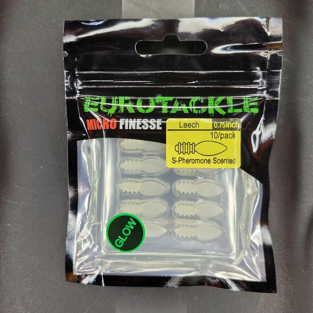 Catch more fish with EuroTackle Mini Leech Superglow 1. Designed with a flat tail for natural swimming action and body ribs for added texture and realism, these soft baits are scented with S-Pheromone Technology to attract fish naturally. Each pack contains 10 lures, making it ideal for freshwater and finesse fishing applications.