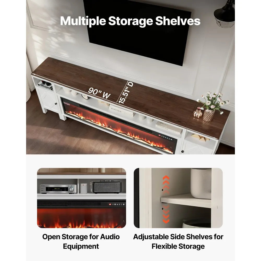 Create a warm and inviting focal point in your living space with this 90-inch farmhouse fireplace TV stand. Designed to support TVs up to 100 inches, this entertainment center combines spacious storage with a built-in 60-inch electric fireplace for year-round comfort and style.