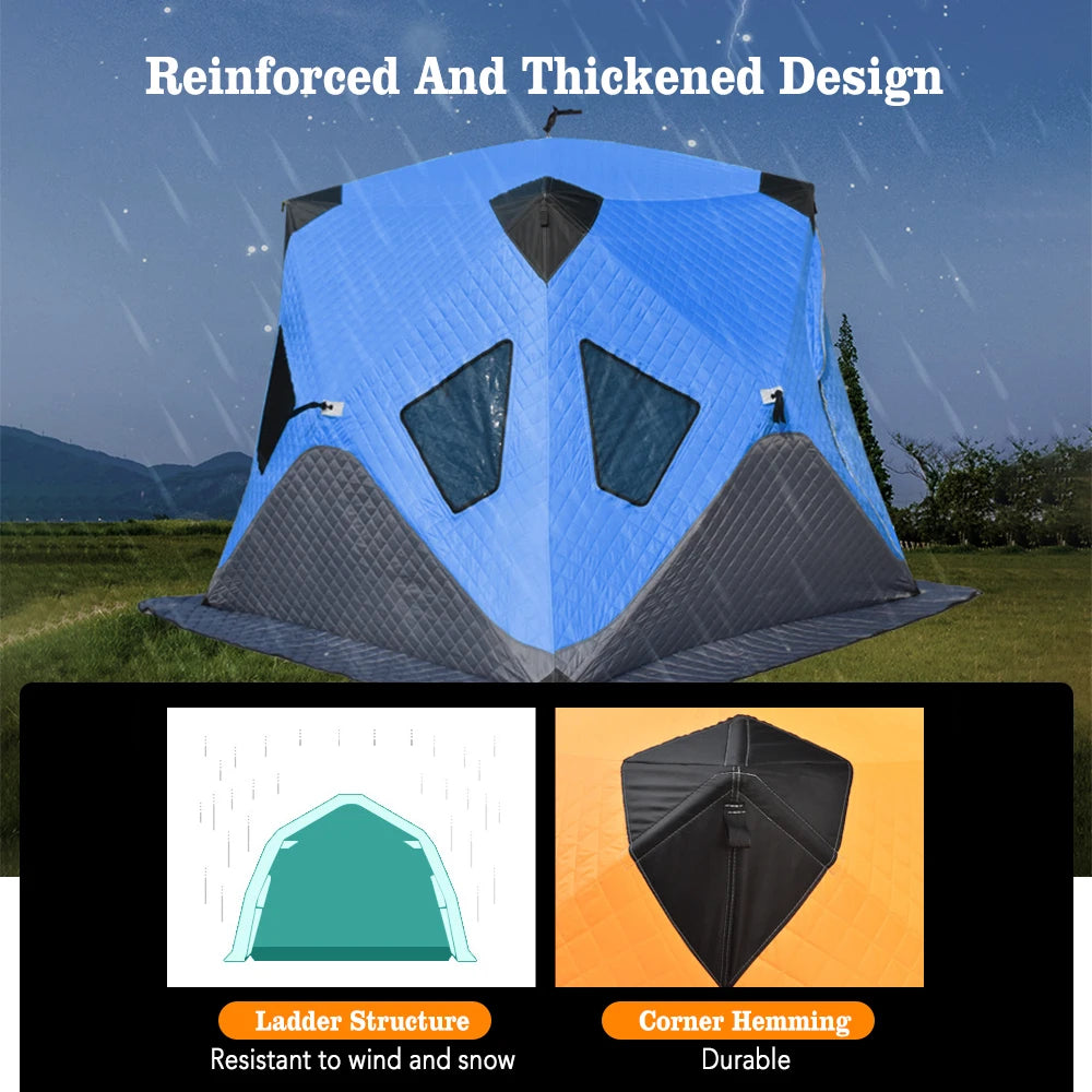 Enhance your winter camping experience with our Fishing Tent, designed for 3-4 people. This upgraded outdoor shelter offers a portable and lightweight solution for anglers seeking comfort in harsh weather. Constructed with waterproof materials, it ensures you stay dry and warm during your fishing trips. The spacious interior allows for easy movement, making it perfect for a day on the ice or a weekend camping adventure.