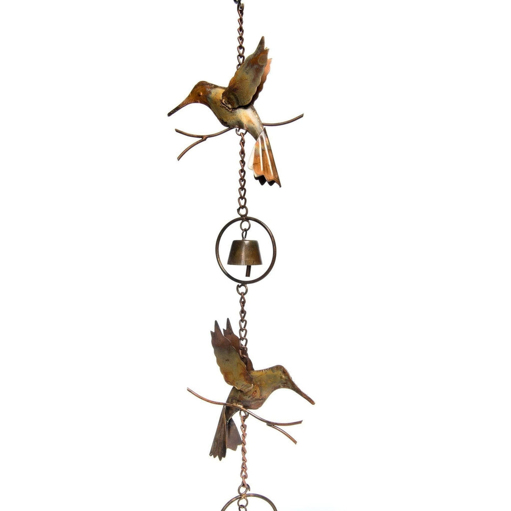Bring charm and tranquility to your outdoor space with this Flamed Hummingbirds and Bells Rain Chain. Designed to guide rainwater from your gutter to the ground in a beautiful cascading flow, it also doubles as an eye-catching garden accent. Featuring delicate hummingbirds and small bells with a flamed finish, this piece adds both function and artistry to your home. Perfect for enhancing patios, gardens, or entryways with a soothing and decorative touch.