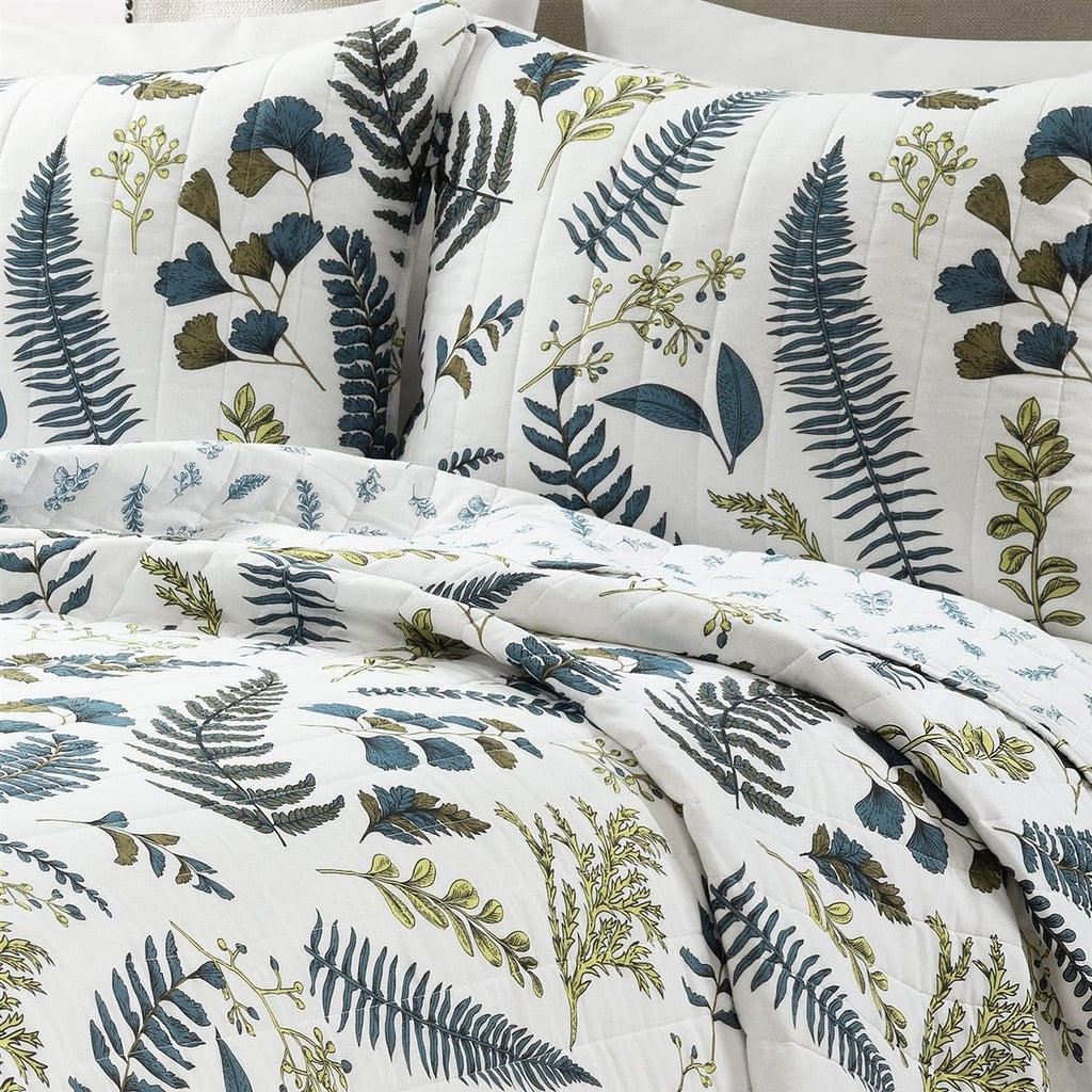 Immerse your bedroom in a serene, nature-inspired ambiance with the Full/Queen Reversible Cotton Lightweight Floral Fern 3 Piece Quilt Set. Ideal for forestcore, boho, exotic, or natural-themed décor, this set combines the beauty of botanical prints with the practicality of a lightweight, breathable fabric.