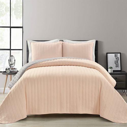Upgrade your bedroom with the Full/Queen Soft Reversible Lightweight Quilt Set in Blush/Grey. Crafted from incredibly soft, cozy crinkle microfiber, this quilt set adds both style and comfort to any bedroom. The vertical striped quilting detail creates a chic, textured look while the solid color design allows for easy coordination with various decor styles.