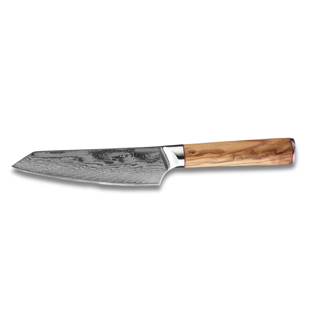 The Ginza Steel MIA 17 Knife combines precision, strength, and elegance. Featuring a 6.5” blade forged from 67 layers of Damascus AUS10 steel, this knife delivers exceptional sharpness, edge retention, and durability. Ideal for detailed kitchen tasks such as slicing, trimming, and intricate cutting, it provides precise control for professional chefs and home cooks alike. The Italian olive wood handle offers a comfortable grip and timeless aesthetic, making this knife both a functional tool and a stylish addition to any kitchen.