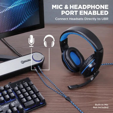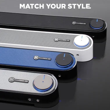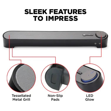 The GOgroove® SonaVERSE UBR LED Sound Bar Speaker combines stunning sound with an eye-catching design. Featuring high-quality audio performance, this soundbar delivers crystal-clear sound with enhanced bass, making it ideal for gaming, movie watching, or listening to music. Its sleek, angled design fits perfectly under your monitor or TV, while the LED lighting adds a vibrant and customizable touch to your setup. With easy-to-use control buttons and versatile connectivity options, the SonaVERSE UBR is a perfect addition to any desktop or entertainment space. Elevate your audio experience and enjoy rich sound with style and convenience.