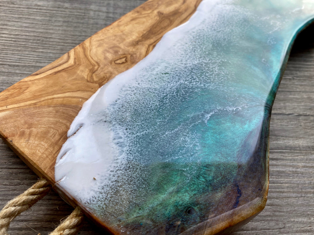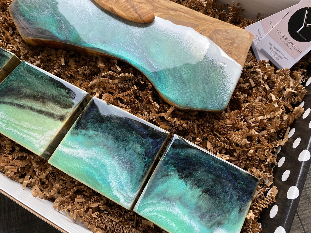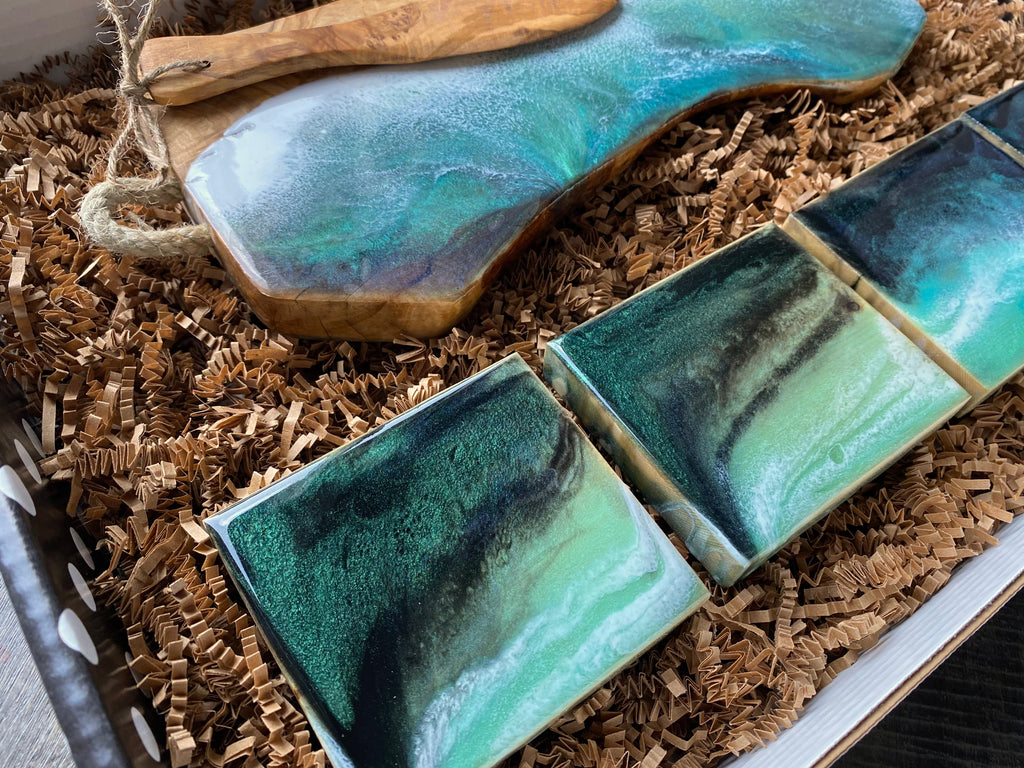 Serve your favourite snacks to your guests with this stunning olive wood charcuterie board gift set. Featuring an ocean inspired design and matching coasters, this elegant set is perfect for presenting cheese, snacks, and appetizers while adding a refined coastal touch to your entertaining.