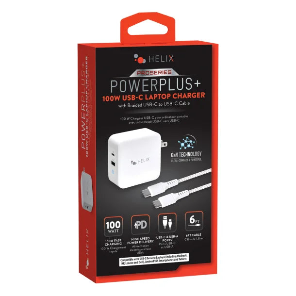 The HELIX Pro Series 100-Watt PD GaN USB-C® Charger with 6-Ft. Braided USB-C® to USB-C® Cable provides ultra-fast and efficient charging for your devices. Powered by GaN (Gallium Nitride) technology, this charger offers a compact and lightweight design without compromising on power. With 100 watts of power delivery, it is capable of charging laptops, tablets, smartphones, and other USB-C® devices quickly and safely. The included 6-foot braided USB-C® to USB-C® cable ensures long reach and durability, making it ideal for home, office, or travel use.