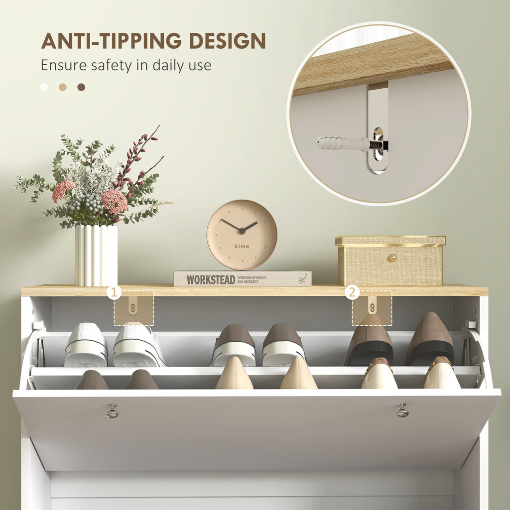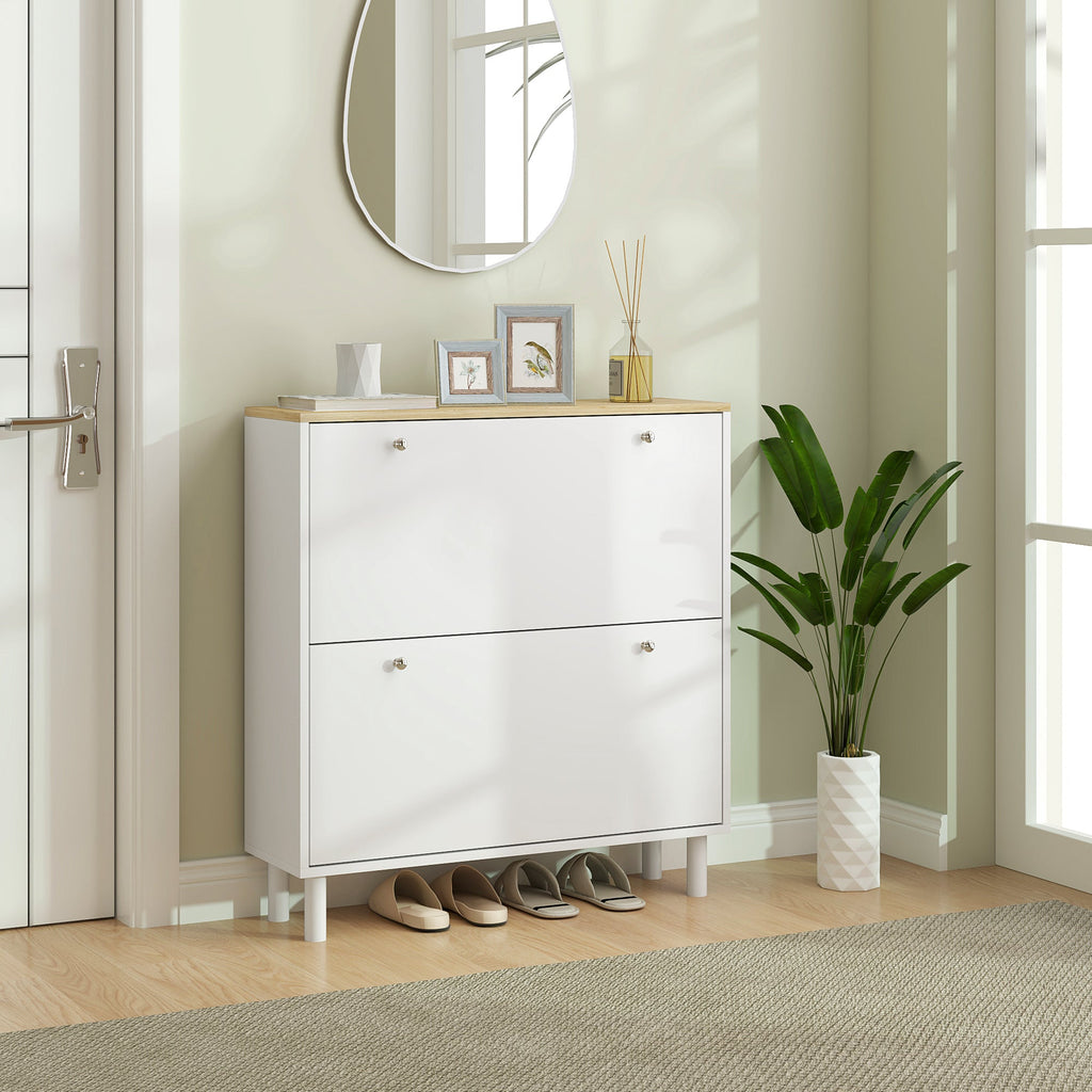 Keep your entryway neat and organized with this stylish narrow shoe cabinet. Featuring two flip drawers that can hold up to 16 pairs of shoes (size CA 10), this cabinet maximizes space while maintaining a tidy appearance. The adjustable two-level shelves offer versatile storage for shoes of various sizes. Its sleek, modern design includes a light oak wood grain top, silver round handles, and a solid color finish, making it a perfect complement to any entryway. Crafted with solid wood legs and an anti-tipping design, it ensures both stability and safety in your home. Easy assembly is required to complete this functional yet chic storage solution.