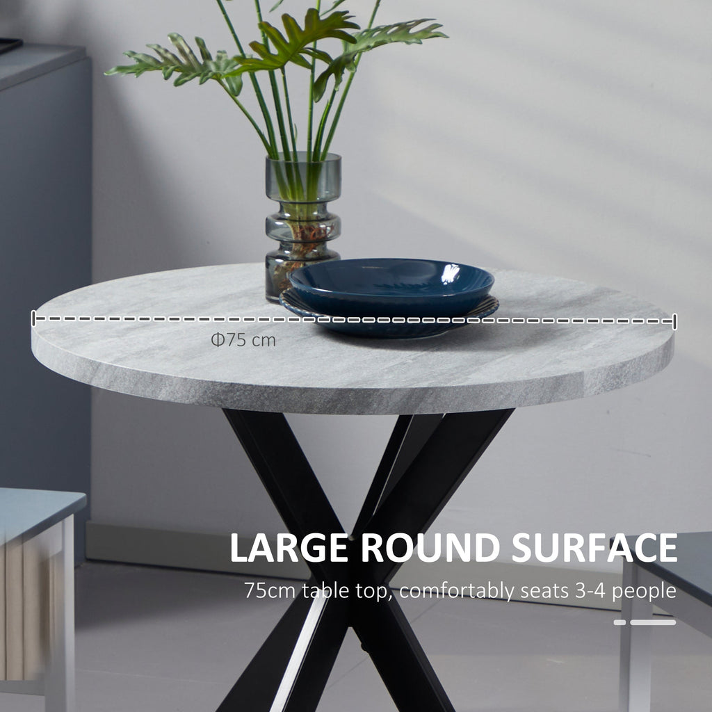 Bring a touch of modern elegance to your home with this stylish round dining table. Featuring a select MDF top with a veneered faux stone finish and sleek black crisscross legs, this table adds a contemporary charm to any dining area. The 29.5" diameter top comfortably seats 2-4 people, providing ample space for your favorite meals like pasta, steaks, salads, and desserts. The heavy-duty construction includes a 1.2" thick tabletop and powder-coated steel cross legs, supporting up to 130 lbs for long-lasting use. The adjustable foot pads ensure stability, even on uneven floors, while preventing scratches. Ideal for everyday meals, this easy-to-clean table also adds a practical yet stylish element to your space. Assembly is required for quick and simple setup.