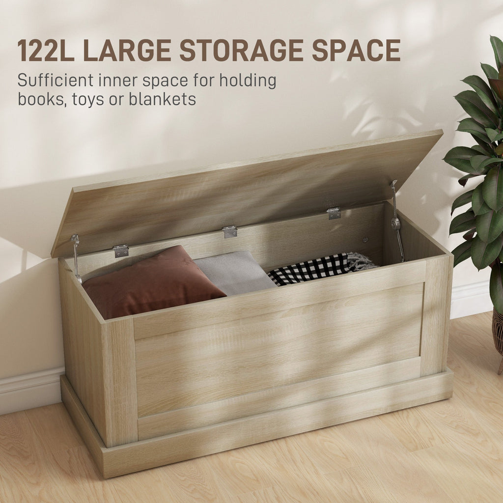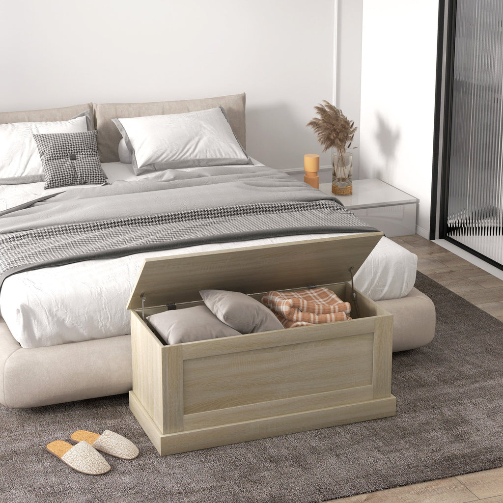 Maximize your home’s storage and seating solutions with this versatile and spacious storage bench. With a large inner compartment, it provides plenty of room to store household items such as blankets, toys, shoes, or seasonal accessories, keeping your living area neat and organized. Designed with safety in mind, it features a built-in safety hinge on the lid to prevent sudden closures, making it a secure choice for family use. This multifunctional storage chest is crafted from durable melamine-coated particleboard and enhanced with anti-slip foot pads for added stability and floor protection. With a top weight capacity of 300 lbs (136 kg), it doubles as a comfortable seating option or a stylish end-of-bed bench. The sleek, contemporary design, highlighted by a natural wood grain finish, effortlessly blends with various home décor styles, from modern to rustic. Easy to assemble and built to last, this storage bench is the perfect combination of function, comfort, and style, ideal for bedrooms, entryways, or living spaces.