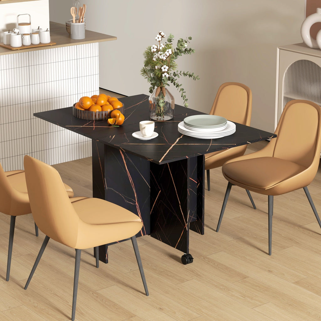 Bring style and functionality to your space with this elegant folding dining table. Its sleek, minimalist design makes it a versatile addition to any home, office, or dorm room, complementing a variety of decor styles. This modern table features an expandable design, making it perfect for homes where space is limited. When fully extended, the table comfortably seats up to six people, ideal for family meals or gatherings. The tabletops on both sides can be lifted and locked into place, and then dropped back down to form a compact unit when not in use. Two rolling castor wheels ensure smooth mobility, allowing you to move the table effortlessly to any room. You can use it as a dining table in the kitchen or a side table in the living room. Made of durable particle board with a melamine coating, this table is built to last and withstand daily use, while the foldable design ensures easy storage when needed.