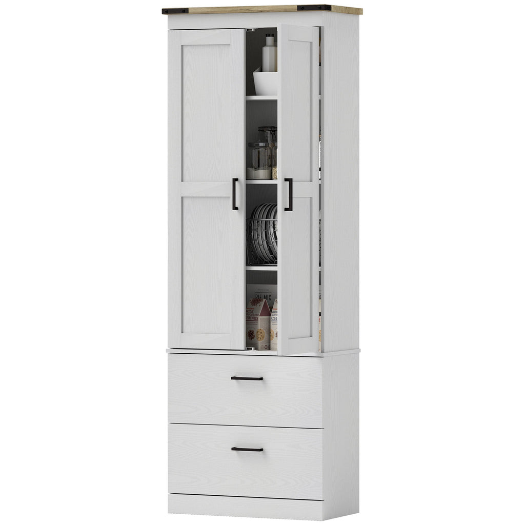 This tall farmhouse-style kitchen pantry cabinet combines spacious storage with rustic charm. Featuring a 4-tier cabinet and two drawers, it provides ample space to organize kitchen essentials, cookware, and pantry items. With two 3-level adjustable shelves, you can customize the layout to accommodate items of different sizes. The cream white wood grain finish, retro brown top, and black accents bring a touch of elegance and warmth to any kitchen. Built for stability and safety, this freestanding storage cabinet includes anti-tipping hardware for added security.
