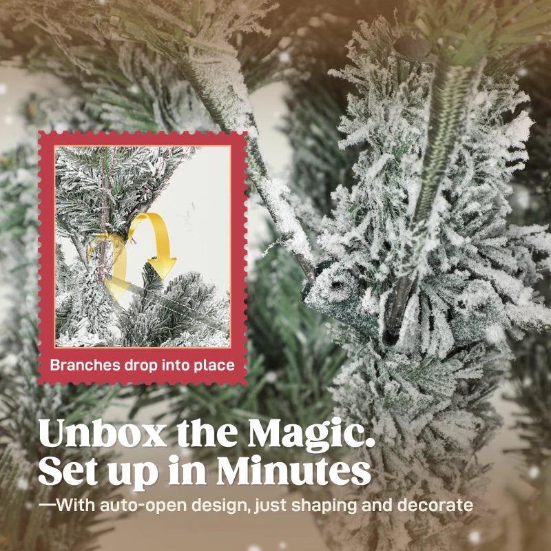 7FT Full Flocked Tree: Tall and elegant with snow-covered pine tips for a realistic winter look.