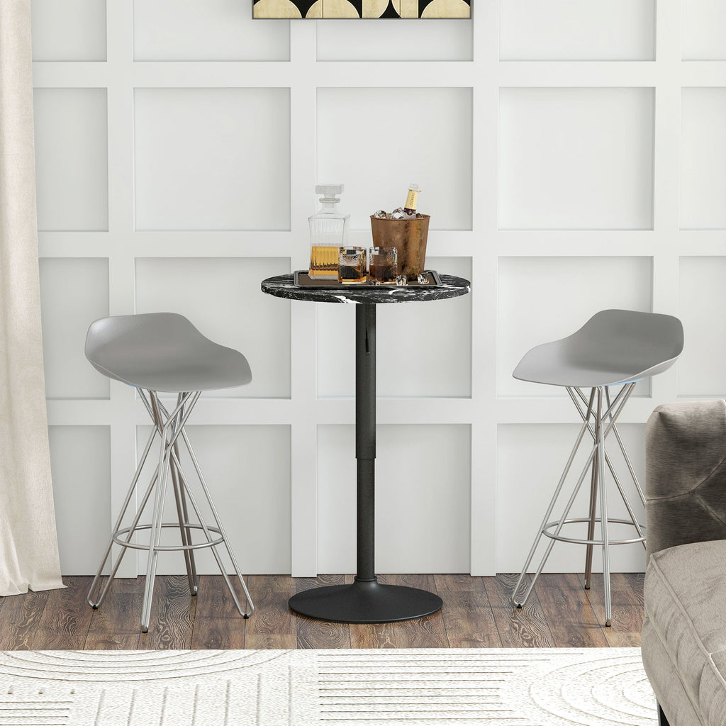 This modern bistro table seamlessly combines classic pub table design with a modern twist, making it an ideal fit for your kitchen, bar, or patio. With a convenient height adjustment feature, it can be set from 27" (counter height) to 37" (table height) using gas hydraulics, making it perfect for accommodating both seated and standing guests. Whether creating a cozy breakfast nook or a lively party setting, this versatile table comfortably seats two, providing an ideal spot for eating, drinking, and mingling. Its melamine faced particle board tabletop is both water-resistant and scratch-resistant, ensuring easy maintenance. The powder-coated steel base offers stability, while the non-slip foot pad protects your floor from scratches. Compact and stylish, this bistro table is perfect for small spaces like apartments, kitchens, or patios.