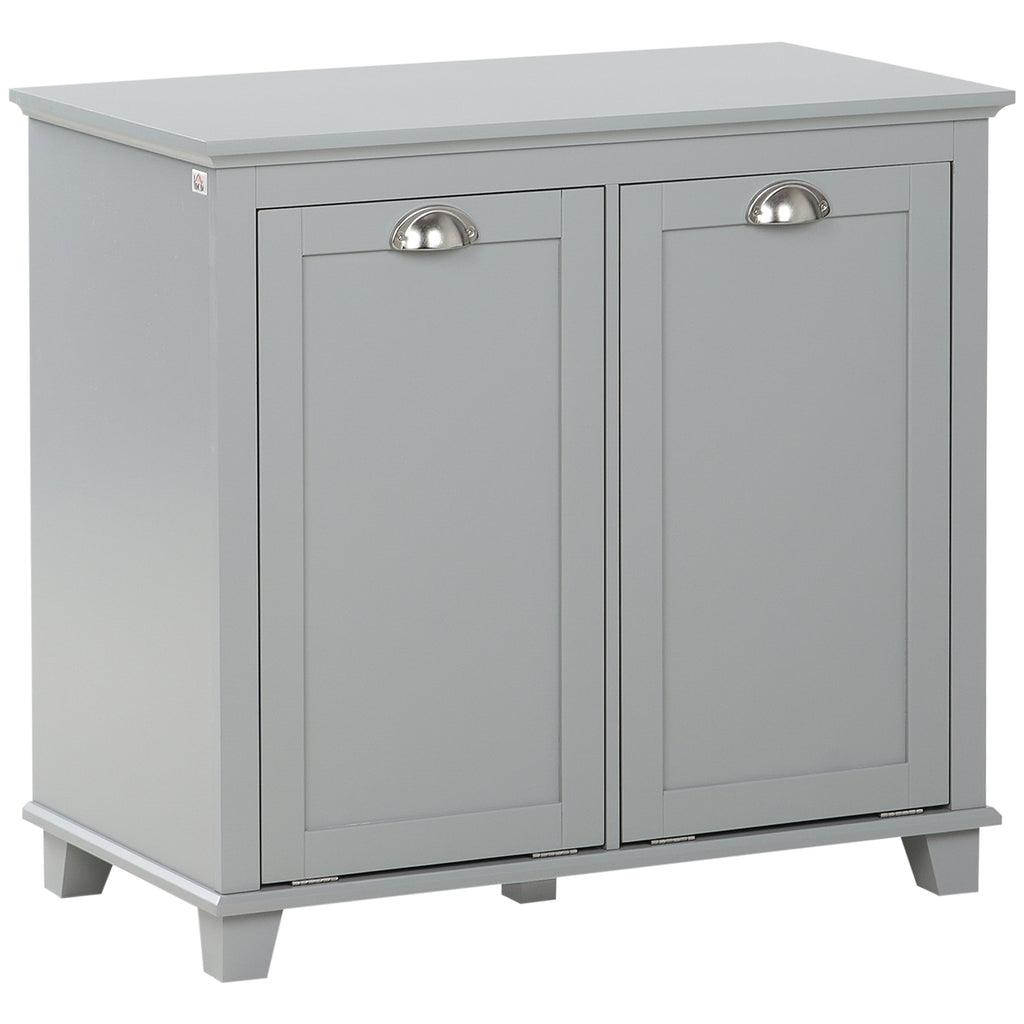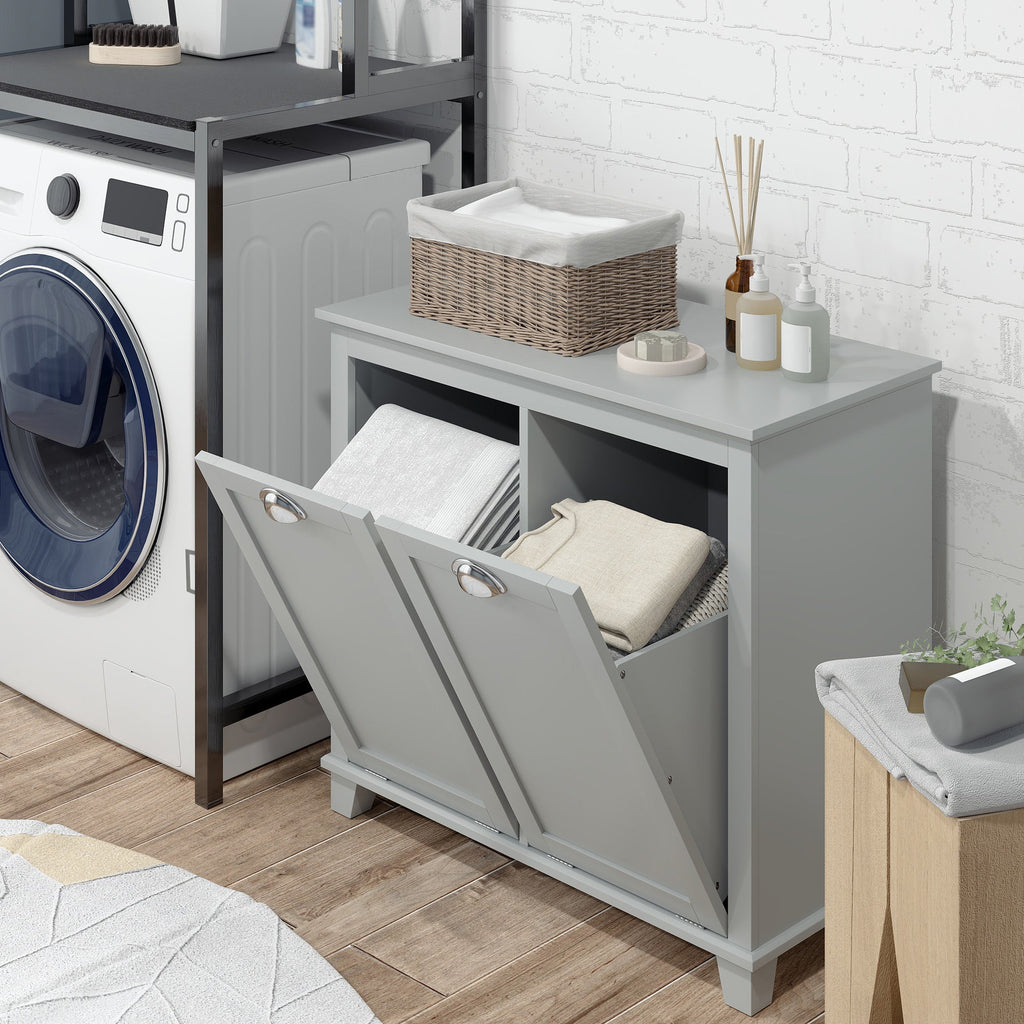Keep your laundry area neat and organized with this functional and stylish bathroom floor cabinet. Featuring a front tilt-out hamper design, it provides convenient and ample storage for towels, laundry, or other essentials. The two independent storage cabinets allow for easy separation of light and dark laundry items, ensuring an efficient and organized space. Constructed from durable MDF with a water-resistant painted finish, this cabinet is designed for long-lasting daily use. Its smooth surface makes cleaning effortless, while the anti-tipping feature ensures added safety by allowing secure wall attachment. With a compact yet spacious design, this laundry storage cabinet is a perfect addition to bathrooms, laundry rooms, or washrooms.