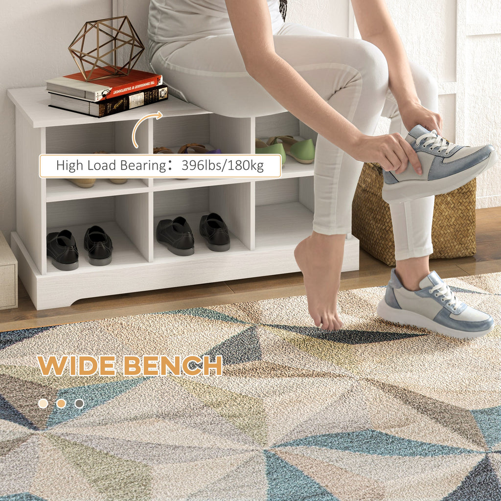 Enhance the organization and style of your entryway with this multifunctional 5-in-1 shoe storage bench and rack. Designed to optimize space, it features a top shelf for additional storage, wall cubes for display or extra storage, four hooks for coats and bags, and a shoe bench that can hold up to six pairs of shoes. Crafted from durable particleboard and MDF for a stable foundation, this hall tree is built to last. The modern white finish adds a sleek touch that easily integrates into any room, making it ideal for hallways, bedrooms, or living rooms. Stay organized and keep your home tidy with this stylish and practical storage solution.