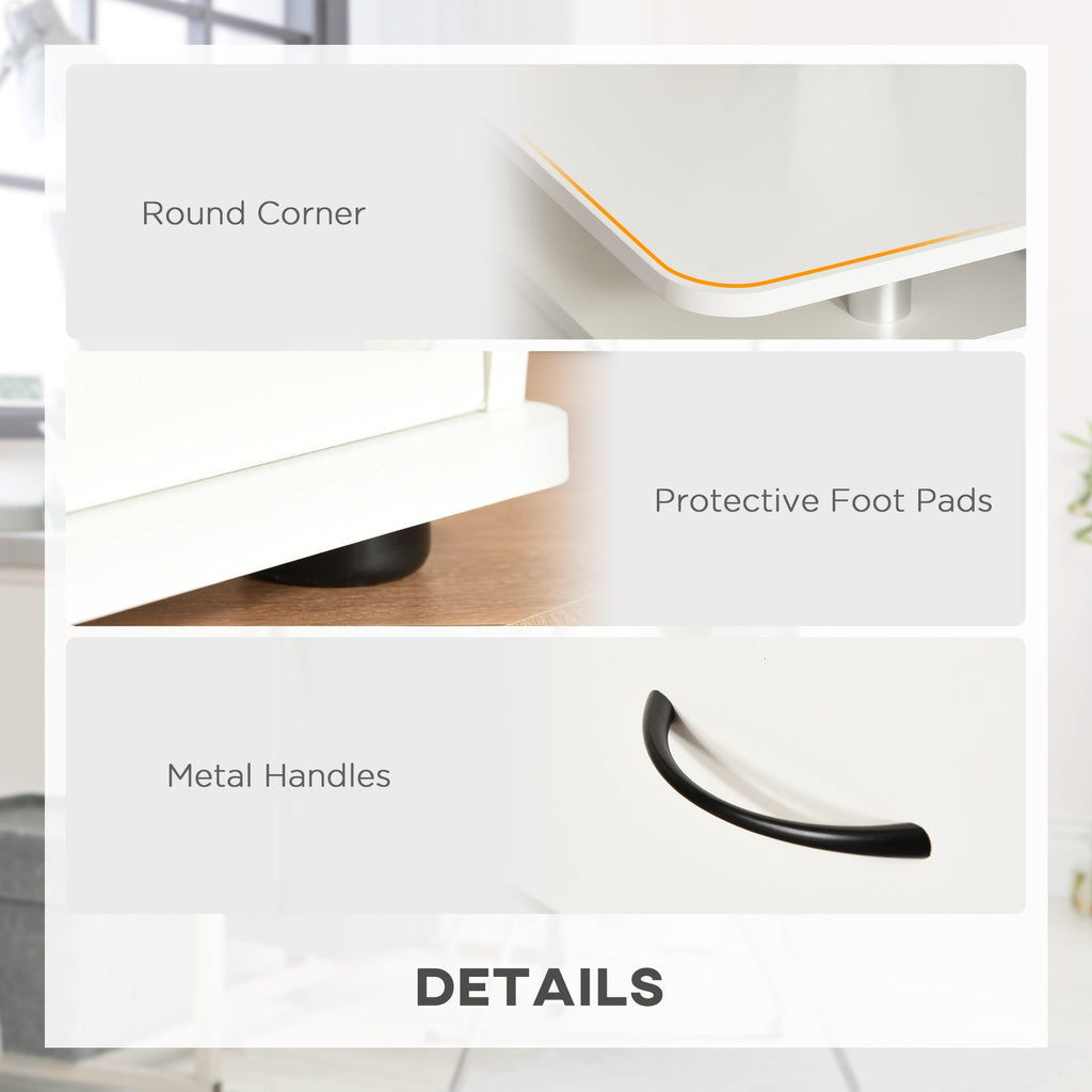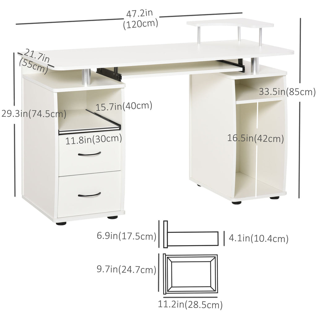 This compact modern computer desk is designed to fit perfectly into small rooms or spaces while providing ample storage for all your office essentials. It features an elevated printer rack, 2 pull-out drawers, a small compartment, a CPU stand, a keyboard tray, and a sliding scanner shelf, offering everything you need for a functional and organized workstation. The desk also comes equipped with cord management solutions, featuring 2 holes on each side to keep cables neatly organized and out of sight. With sleek, simple lines and a rounded-edge desktop, this versatile desk is perfect for any room, dorm, or office, adding a clean and modern touch to your space.