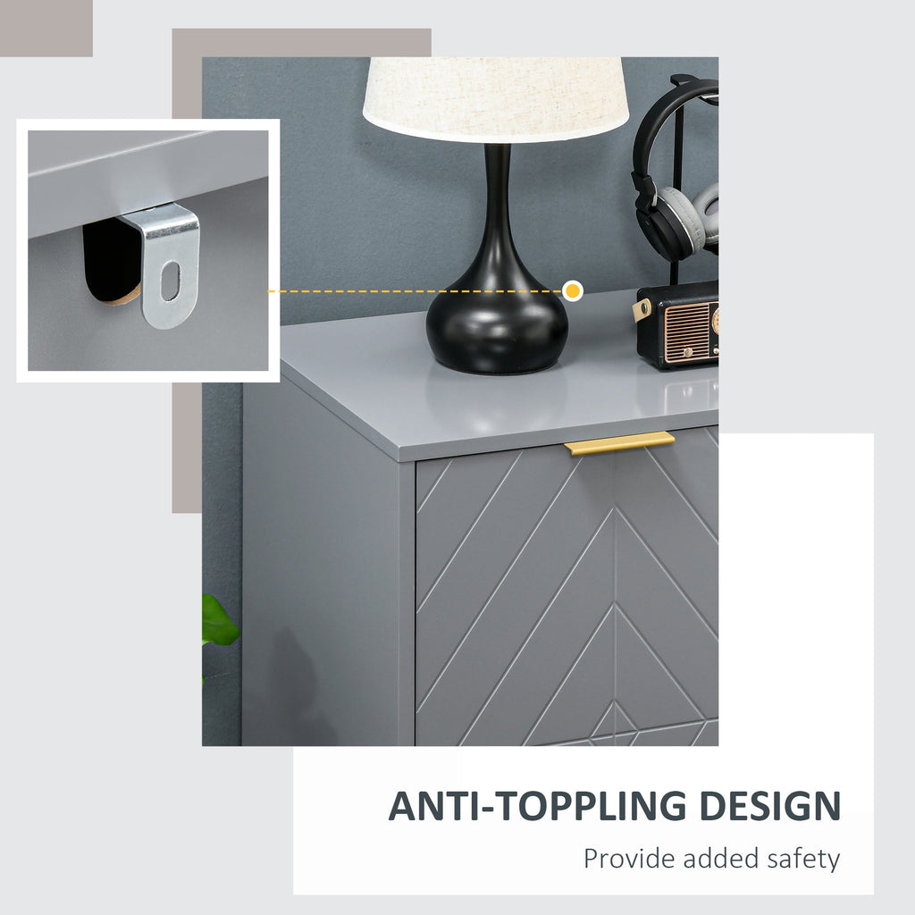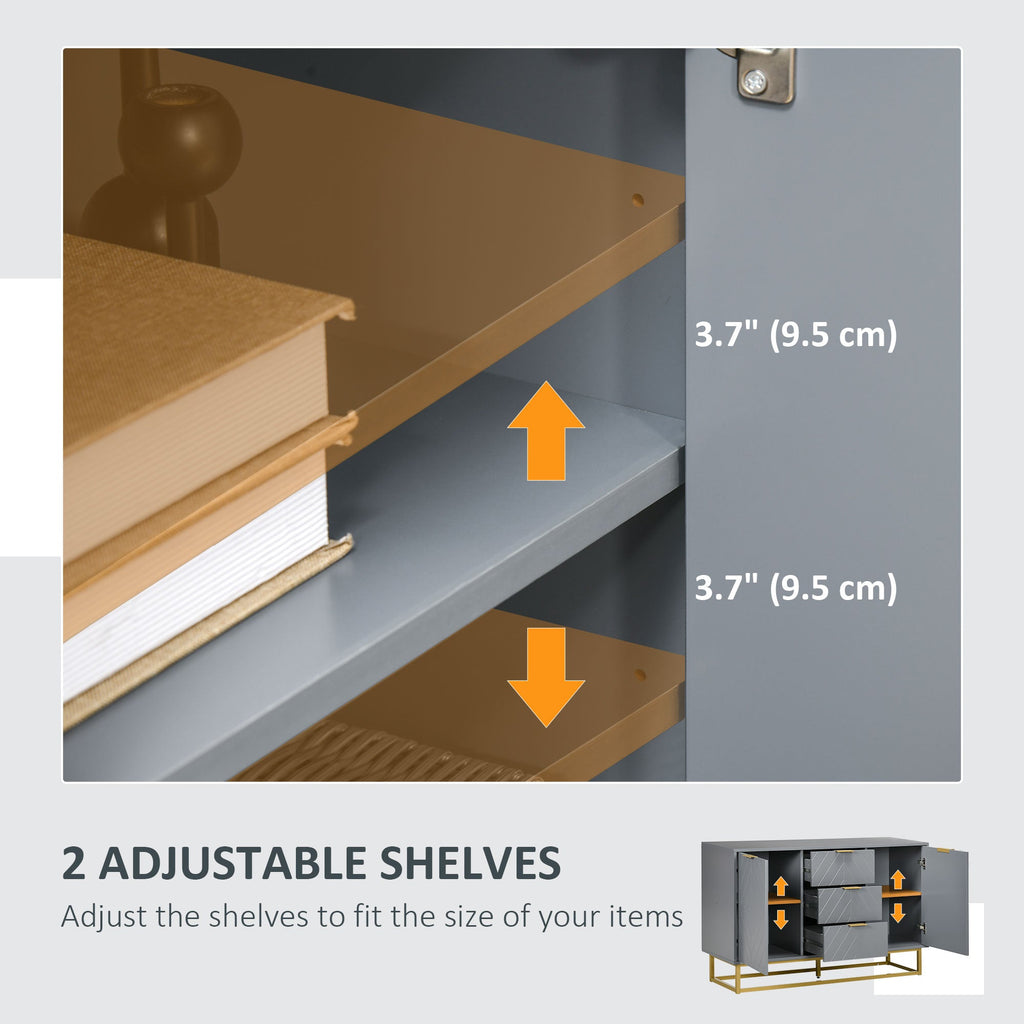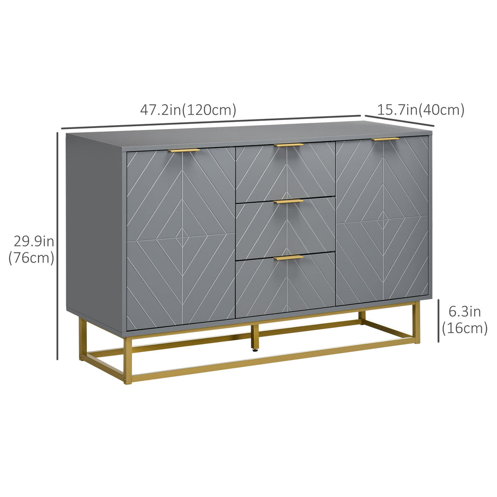 Elevate your home decor with this elegant sideboard, featuring geometric doors with golden accents for a sophisticated touch. Perfect for the living room, kitchen, or any space needing a modern update. With versatile storage, it includes three smooth slide drawers for small accessories and a two-door cabinet with ample space for daily supplies. The large top can be used as a coffee bar or for displaying decorative items. Inside, two adjustable shelves provide customizable storage solutions. Crafted from durable MDF and metal, this cabinet ensures stability with an anti-tipping kit and extra bottom leg for safety. A stylish and functional addition to any home.