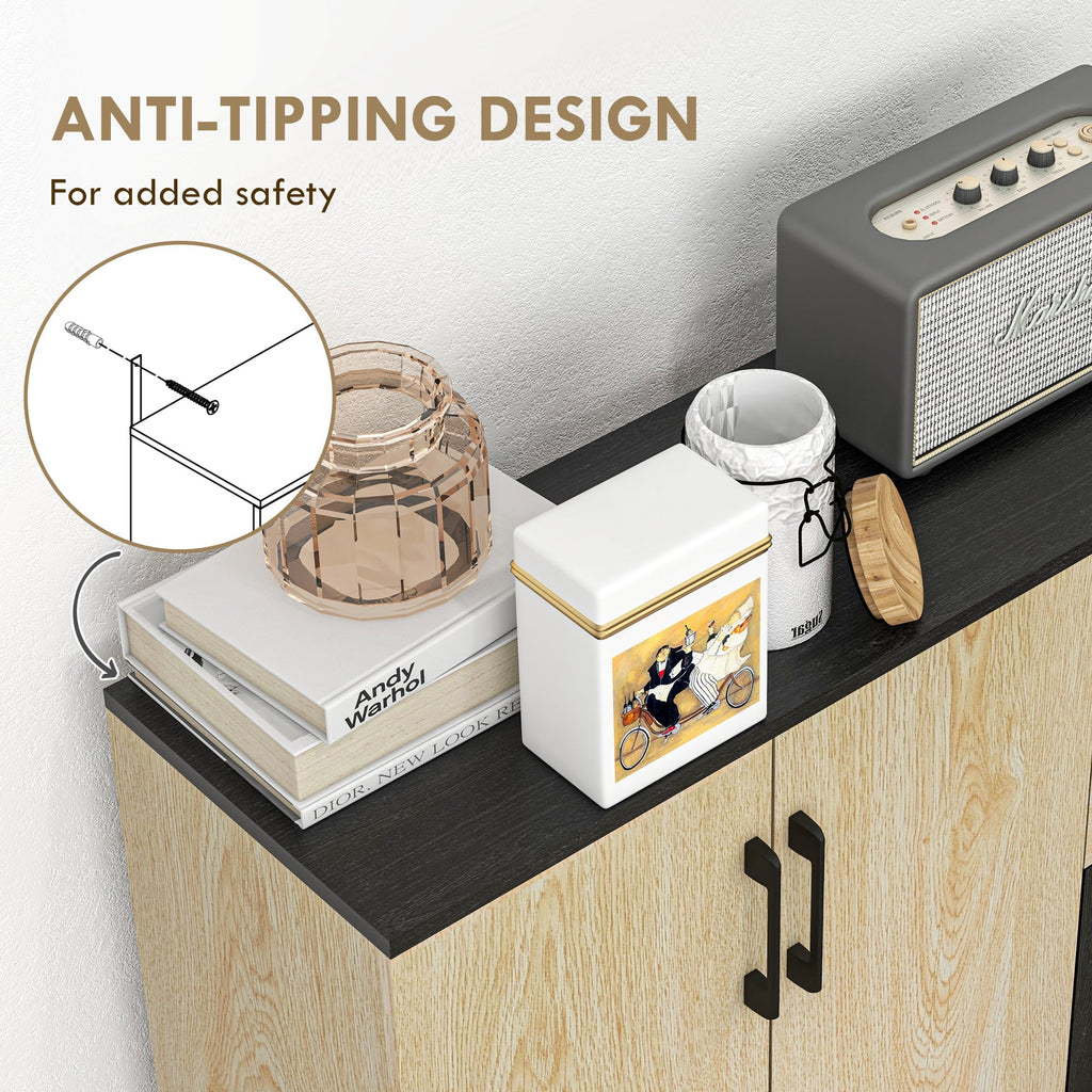 This versatile sideboard combines durability, style, and ample storage to enhance any room in your home. Constructed from sturdy MDF with a water-resistant painted surface, it ensures long-lasting use and easy maintenance. The sideboard features two transparent glass-paneled doors, offering visibility of the contents inside, and a round knob handle for easy access. With an adjustable shelf and a bottom shelf, it provides plenty of space to organize kitchenware, bathroom supplies, or anything you need stored. The minimalist dark gray finish and simple design make it a perfect addition to a variety of home settings, whether in the kitchen, pantry, or even the bathroom.