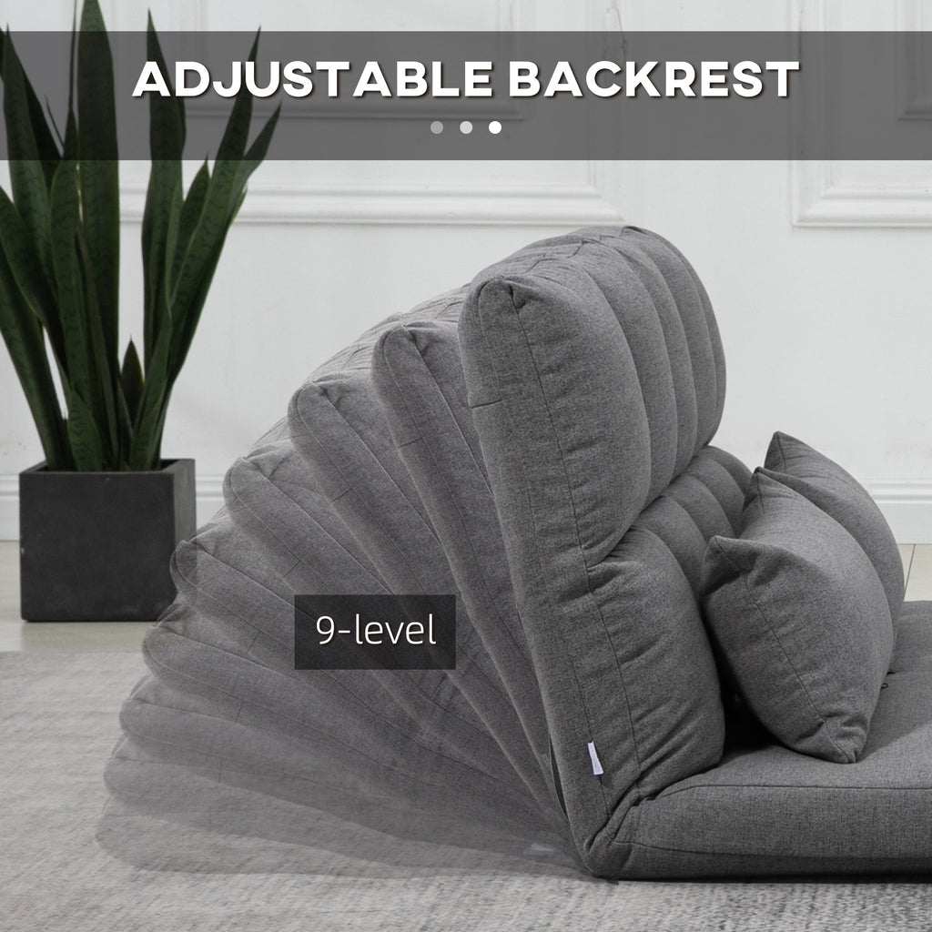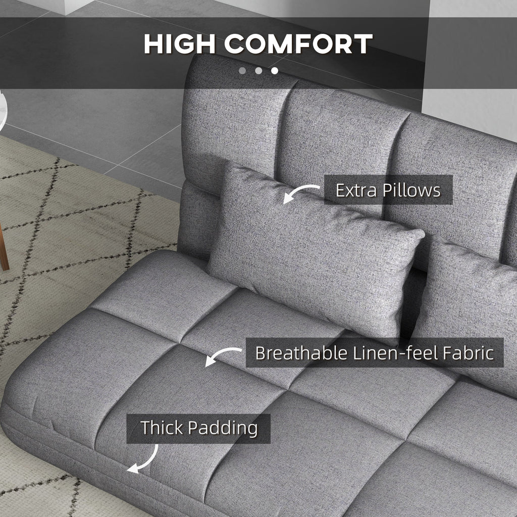 Experience ultimate comfort and versatility with this 3-in-1 floor sofa, designed to transform seamlessly into a cozy lounger or a comfortable bed. Whether you're reading, watching TV, gaming, working, or simply relaxing, this multifunctional sofa is perfect for any space, including living rooms, bedrooms, or gaming areas. The adjustable backrest offers nine different positions, reclining up to 180°, allowing you to find the ideal angle for your comfort. With a spacious 51.2" (130 cm) wide seat, this gaming couch comfortably accommodates two people, while the soft linen-feel fabric and plush padding ensure breathability and superior relaxation. Two included pillows provide additional support for your neck and back. When not in use, the floor lounger can be fully flattened and conveniently stored under your bed, keeping your space neat and clutter-free. Built with a sturdy steel frame, this lazy sofa guarantees durability and stability for long-term use. Best of all, it arrives fully assembled—just unfold and enjoy!