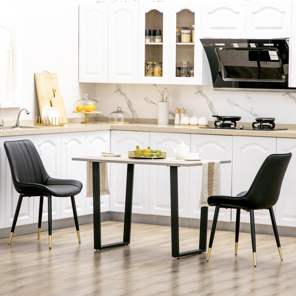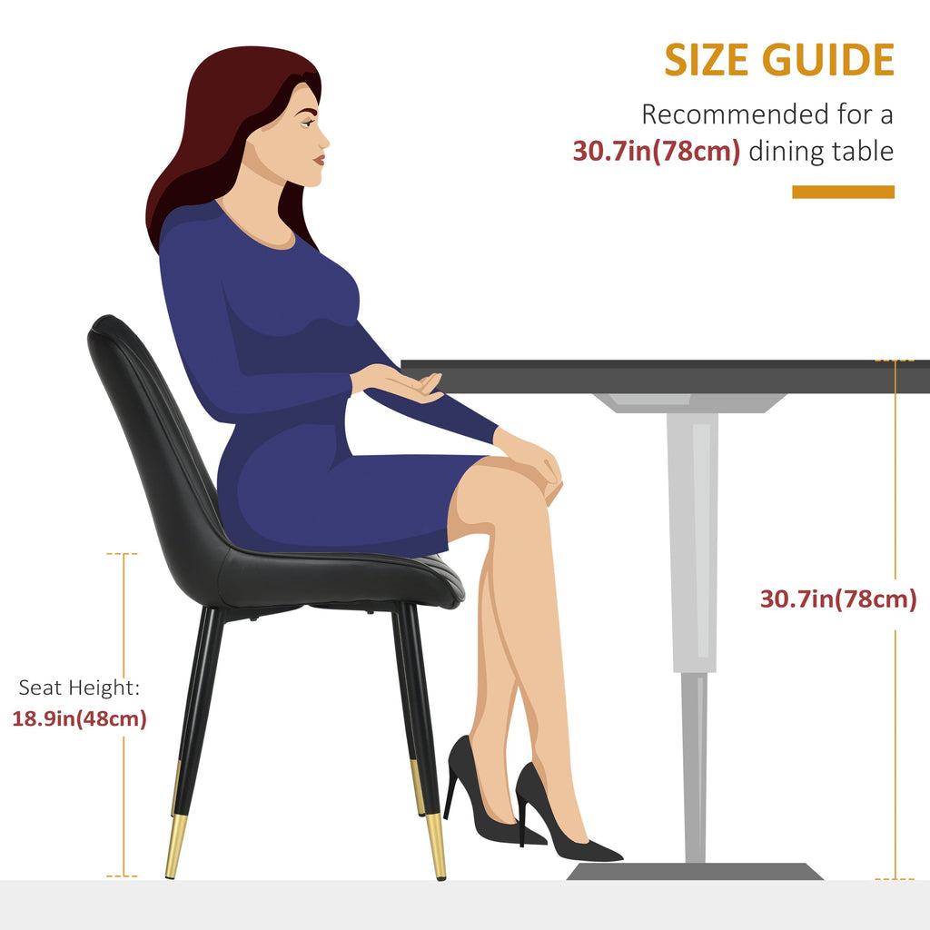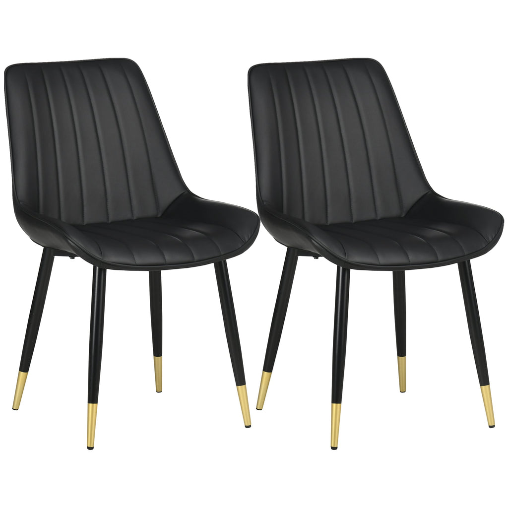 Upgrade your dining and living spaces with this elegant set of two modern dining chairs, perfect for dinners, conversations, or accent seating. Upholstered in luxurious PU leather, these chairs offer a sleek, easy-care surface that resists wear and water while providing excellent comfort. The thick padded seat and back ensure superior support, making them ideal for relaxing moments. Designed with a modern aesthetic, the chairs feature delicate channel tufting for enhanced structure and gold-finished legs that add a touch of sophistication. Their compact design allows them to be neatly tucked under a table when not in use, maximizing space efficiency. Built with sturdy powder-coated steel spreader legs, these chairs provide stability and durability for daily use. Non-slip foot pads prevent scratches on your floor, making them a practical yet stylish addition to any home. Measuring 20.5" W x 24" D x 33.1" H (52 x 61 x 84 cm) with a weight capacity of 264 lbs (120 kg), these chairs require simple assembly.