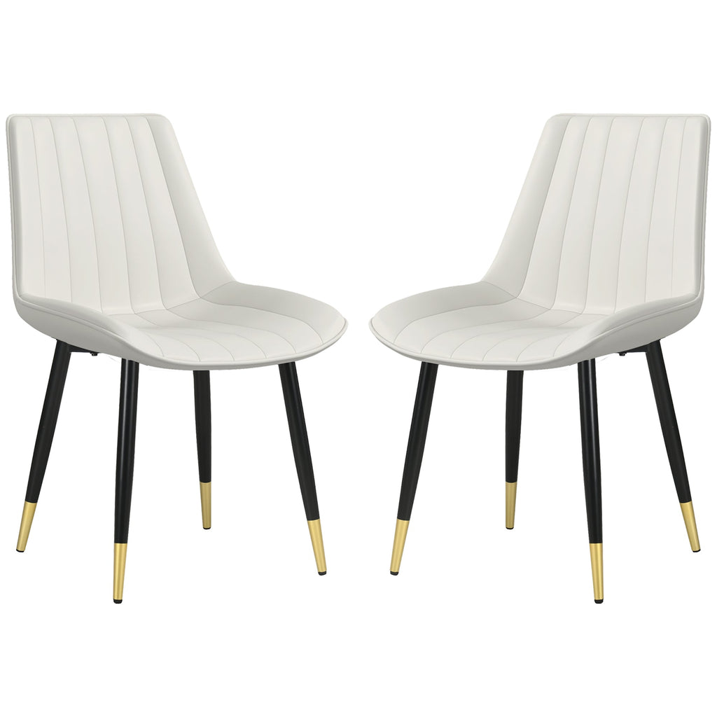 Enhance your dining or living space with this stylish set of two modern dining chairs. Designed for comfort and versatility, these chairs are perfect for dining, casual conversations, or as accent pieces in your home. Upholstered in luxurious and easy-care PU leather, they resist wear and water while providing a soft and comfortable seating experience. The thick padded seat and back offer excellent support, making them ideal for extended use. With a sleek modern aesthetic, these chairs feature delicate channel tufting for added elegance and gold-finished legs that elevate the look of any space. The compact design allows for easy storage under a desk or table when not in use. Built with sturdy powder-coated steel spreader legs, they provide reliable stability, while non-slip foot pads protect your floors from scratches. Measuring 20.5" W x 24" D x 33.1" H (52 x 61 x 84 cm) with a weight capacity of 264 lbs (120 kg), these chairs require simple assembly.