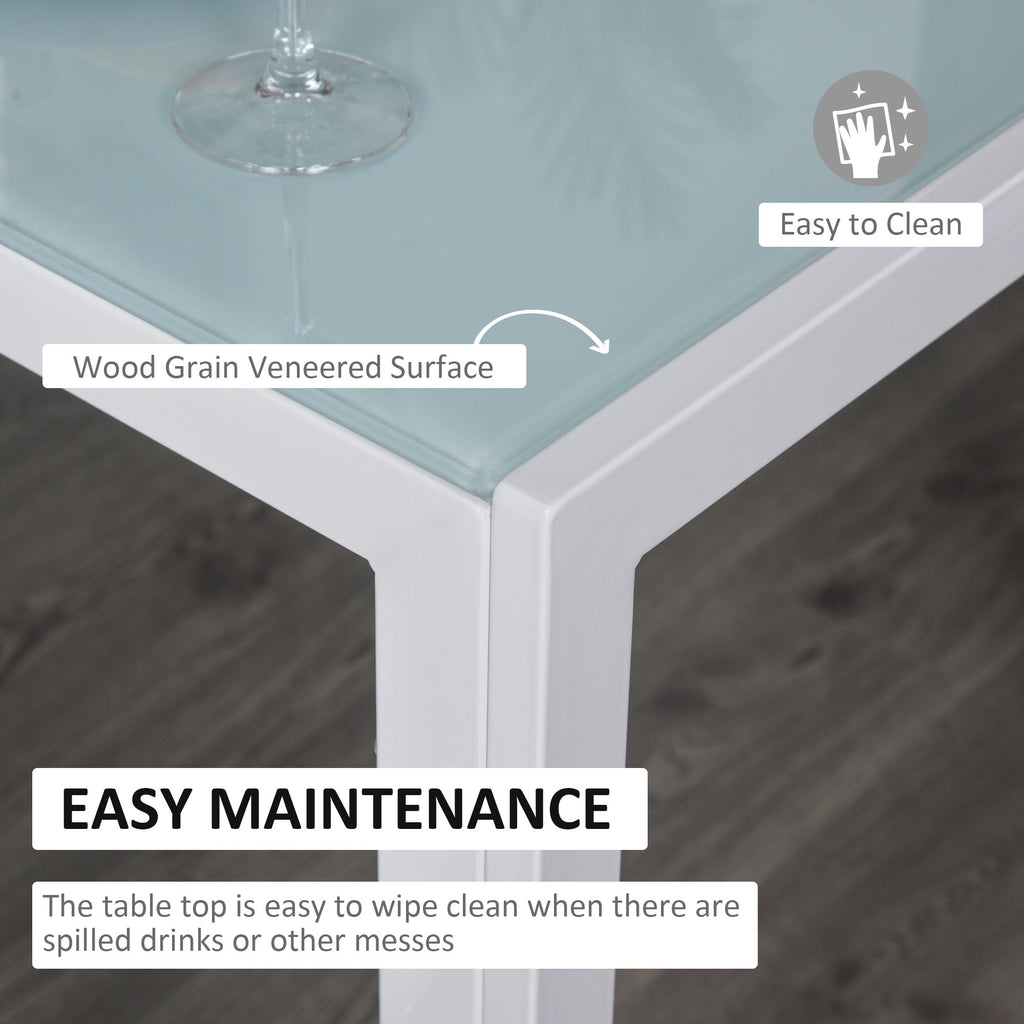 This 5-piece dining table set is the perfect solution for small spaces, offering both style and functionality. The set includes a sleek dining table and four matching high-back chairs, comfortably seating up to four people. The table features a large tempered glass top and a robust steel frame, adding a modern touch to your dining room. It's easy to maintain, requiring just a damp cloth to wipe away spills. The ergonomically designed chairs come with a synthetic padded seat and a slightly curved high back, providing a comfortable and stable seating experience. Designed with space-saving in mind, the armless chairs can be tucked neatly under the table when not in use, keeping your dining area looking tidy and clutter-free. Ideal for apartments, studios, or any small dining area, this set is perfect for maximizing space without compromising on style. Table dimensions are 47.2" W x 27.6" D x 29.5" H, and chair dimensions are 15.7" W x 19.9" D x 38.2" H. The weight capacity is 265 lbs (120 kg) for each chair and 110 lbs (50 kg) for the table.
