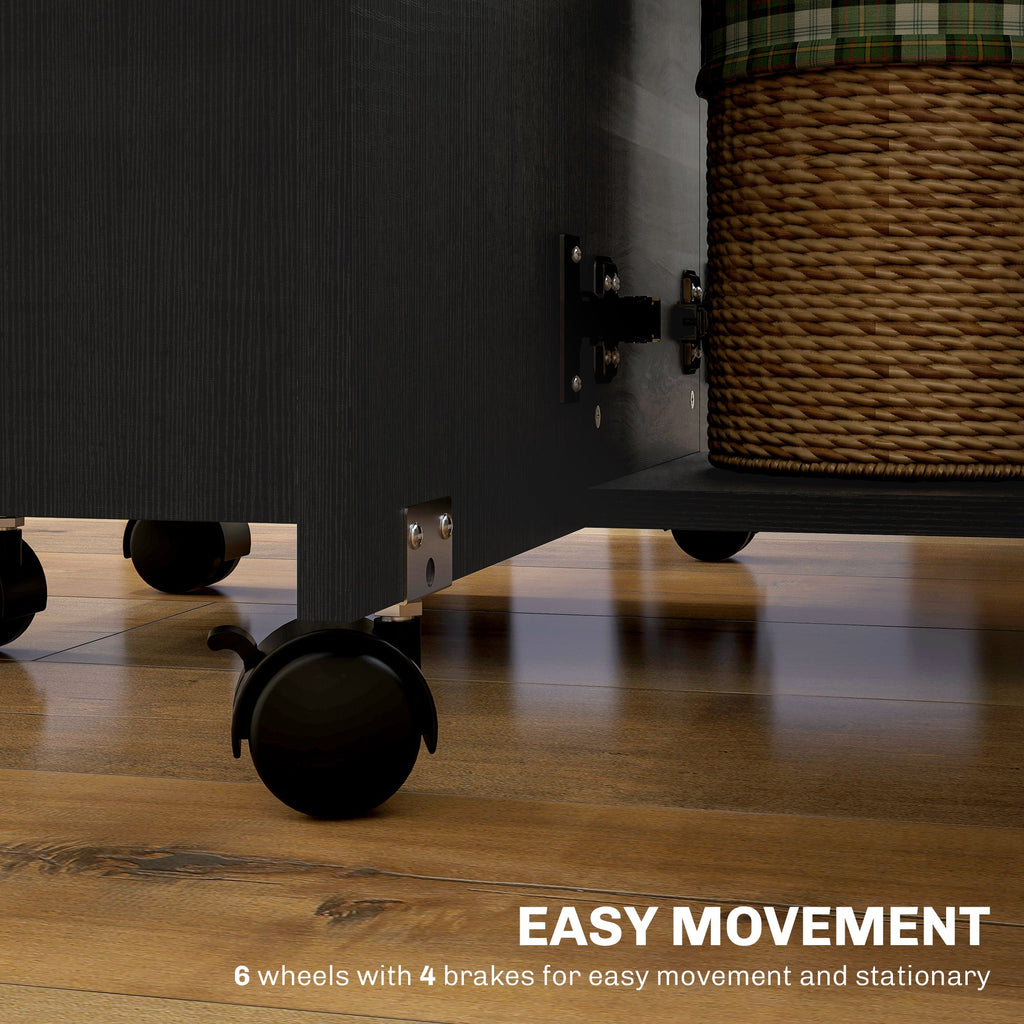 Storage & Movement: Features two drawers, a cabinet, and an open compartment for convenient storage. Six swivel wheels (four with brakes) allow for easy movement