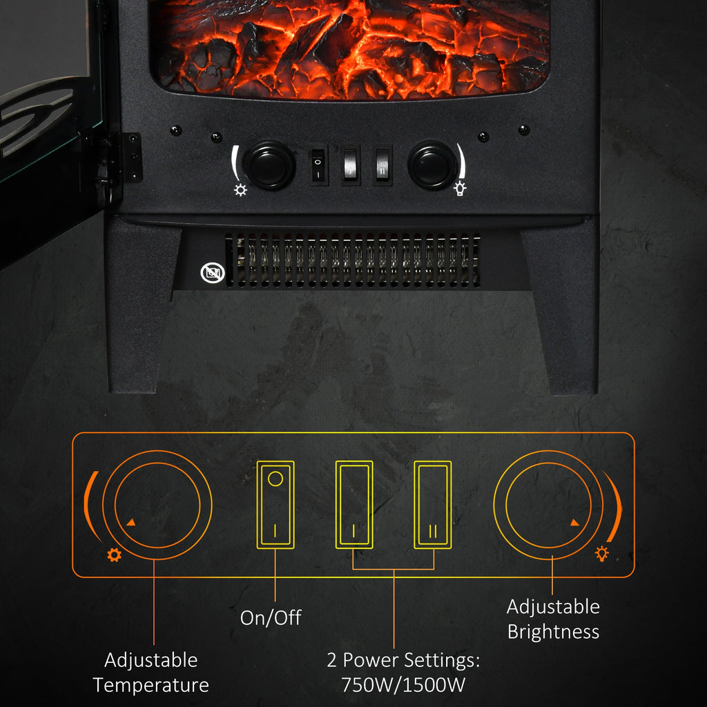 Create a cozy and inviting atmosphere with this freestanding electric fireplace, featuring a realistic log flame effect. The LED dancing flames and burning logs produce a natural fireplace ambiance, offering 180-degree viewing from any angle thanks to the transparent design on three sides. With adjustable brightness, you can set the perfect mood without the smoke or mess of a real fire. The independent flame effect can also be used without the heat function for year-round enjoyment. Easily control the temperature with a dial knob switch and choose between two heating modes, 750W and 1500W, to meet your comfort needs. This compact electric stove is ideal for small spaces, including bedrooms, living rooms, home offices, and RVs, and it covers an area of 161-215 ft². Safety is ensured with an overheating protection feature that automatically shuts off the heater to prevent accidents.