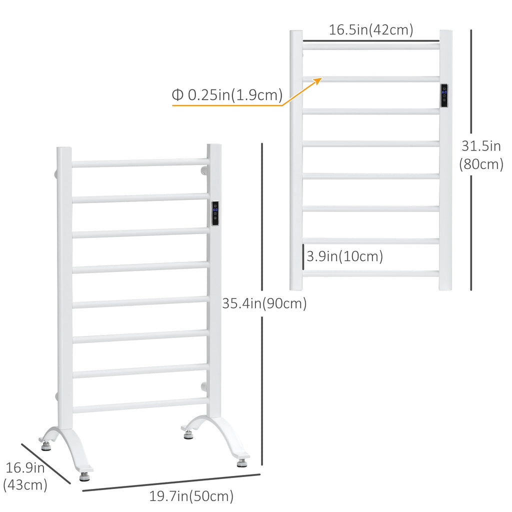 Towel Warmer Dimensions: 19.75" W x 31.5" H (freestanding), 19.75" W x 31.5" H (wall-mounted). Weight capacity: 26.4 lbs. (freestanding), 77 lbs. (wall-mounted).