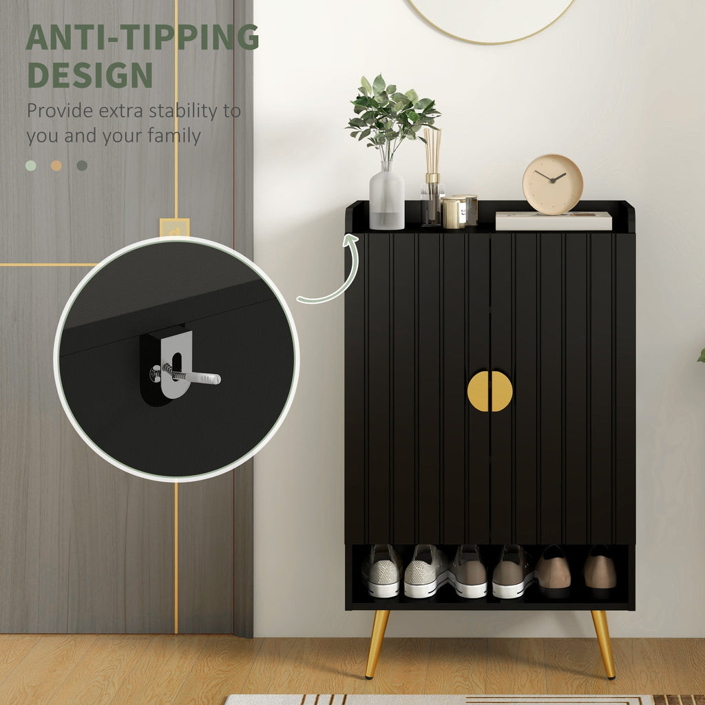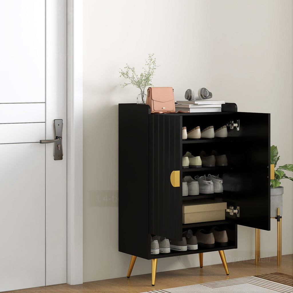 This elegant and stylish shoe cabinet is the perfect addition to your entryway or hallway. With its beaded panel design, gold handles, and legs, it adds a touch of luxury to your home. It features both closed and open storage options, including a 4-tier cabinet with three 3-tier adjustable shelves and an open bottom shelf that can hold up to 15 pairs of shoes (up to CA Men Size 10-10.5). The flat tabletop with protective sides allows you to display decorations, photo albums, or store keys. The cabinet is constructed from durable particleboard and a steel frame, ensuring stability, and comes with an anti-tip design for added safety. Its compact design makes it perfect for limited spaces.