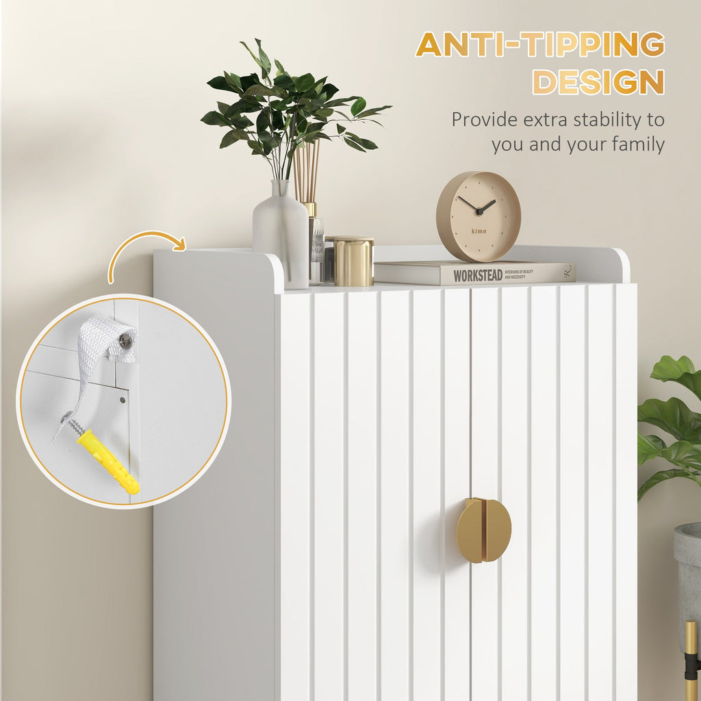 Elevate your entryway with this elegant and stylish shoe cabinet. Featuring a beautiful beaded panel design complemented by gold handles and legs, this cabinet adds a touch of luxury to your home. With both closed and open storage options, it includes a 4-tier cabinet with three 3-tier adjustable shelves to customize your storage needs and an open bottom shelf that holds up to 15 pairs of shoes (CA Men Size 10-10.5). The flat tabletop with protective sides is perfect for displaying decorative items, photo albums, or storing keys. Made with durable particleboard and a sturdy steel frame, this shoe cabinet is stable, easy to maintain, and comes with an anti-tip design for enhanced security. Its compact size makes it ideal for entryways or other limited spaces, while the easy-to-open doors add practicality and style to any room.