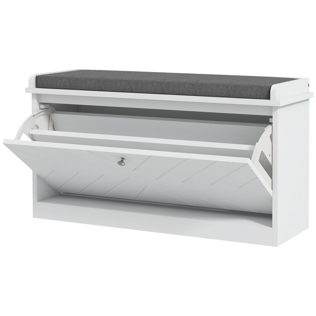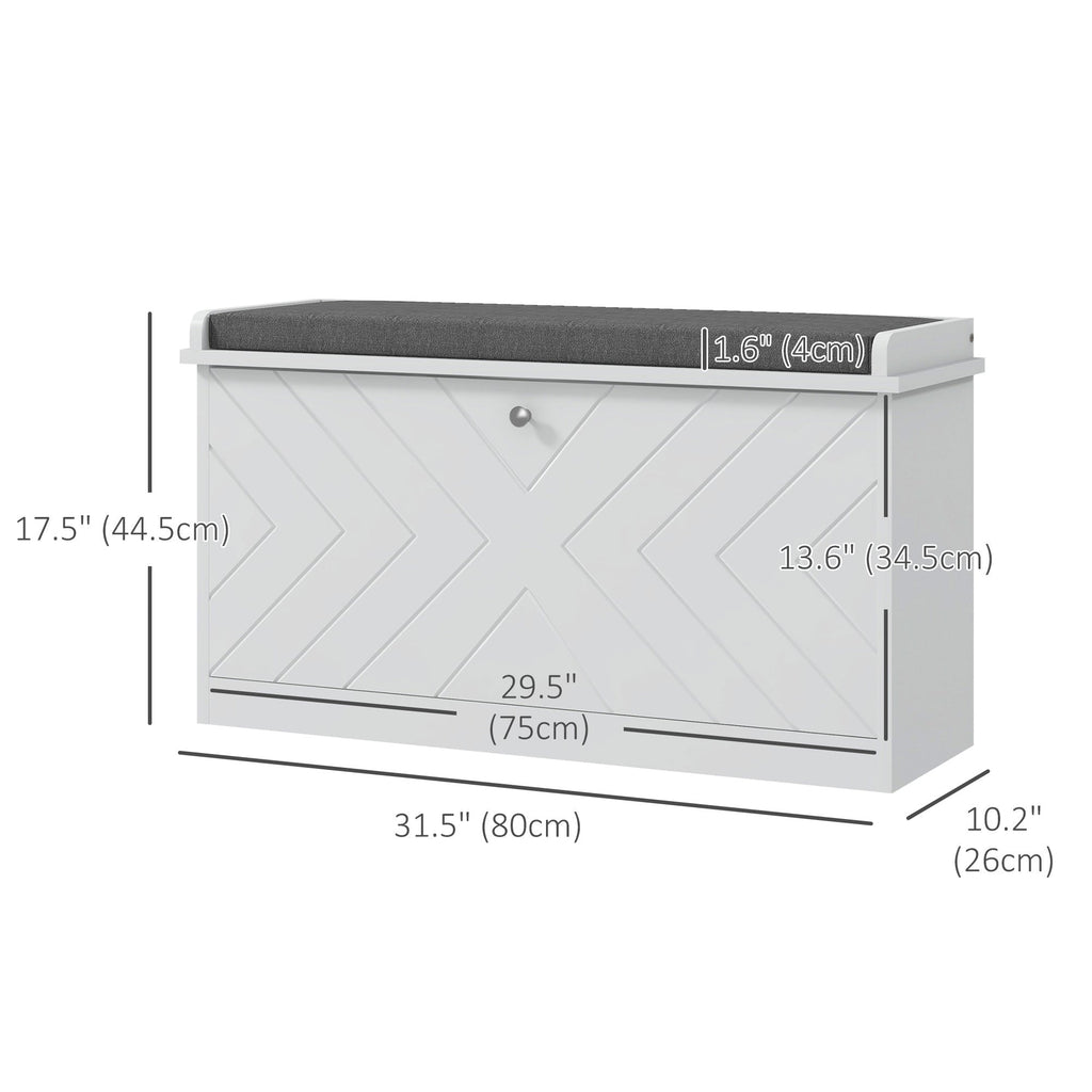 Say goodbye to shoe clutter with this stylish and functional shoe storage bench. Designed with a flip drawer that can hold up to 8 pairs of shoes, this piece features an adjustable internal divider to accommodate ankle boots, high heels, and other footwear. The compact design, complemented by embossed lines and a sleek round handle, makes it perfect for small entryways or living rooms, offering a chic solution without occupying much floor space. Built from durable MDF and particleboard with a painted finish, the bench can support up to 286 lbs, ensuring long-lasting use. The thick, padded cushion wrapped in breathable linen-feel fabric provides a comfortable spot for sitting while putting on shoes or resting. Plus, with easy assembly and a removable cushion cover, this bench offers both convenience and style.