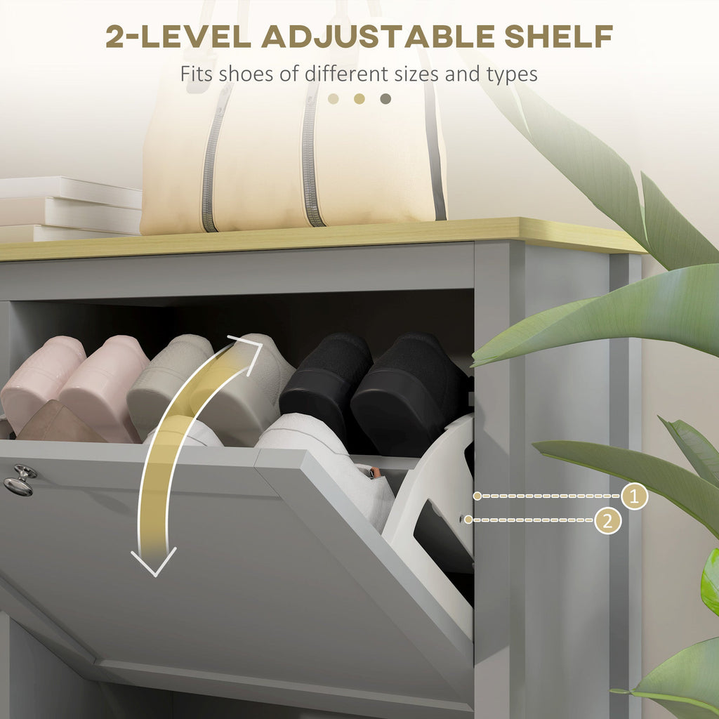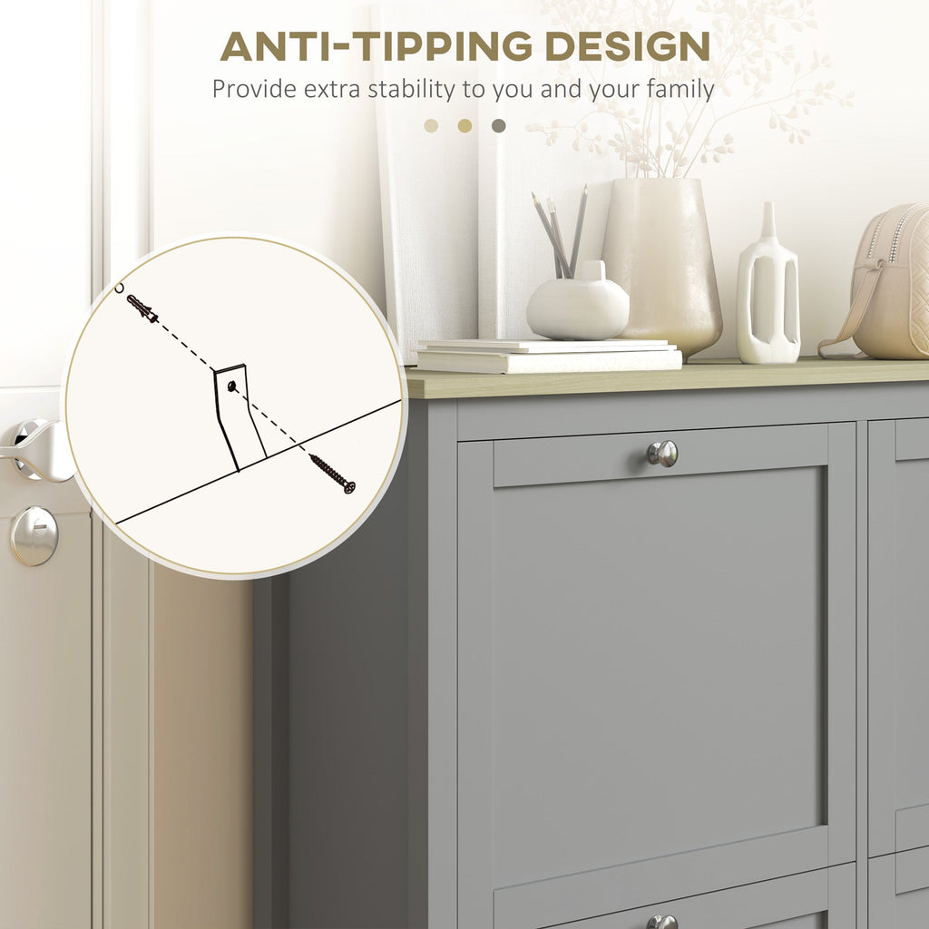 This compact and stylish shoe storage cabinet is the perfect solution for organizing shoes in narrow hallways or limited spaces. Featuring 4 flip drawers with silver handles and adjustable 2-level shelves, this cabinet can hold up to 20 pairs of shoes. The flat tabletop provides additional space for everyday essentials like keys and wallets, keeping them within easy reach. Crafted from durable melamine-faced particleboard, this cabinet is both low-maintenance and long-lasting. The anti-tipping design ensures extra stability, making it a secure and reliable choice for families. Its modern minimalist design, with shaker panels and clear lines, complements a variety of home styles, making it an excellent addition to any entryway or hallway.