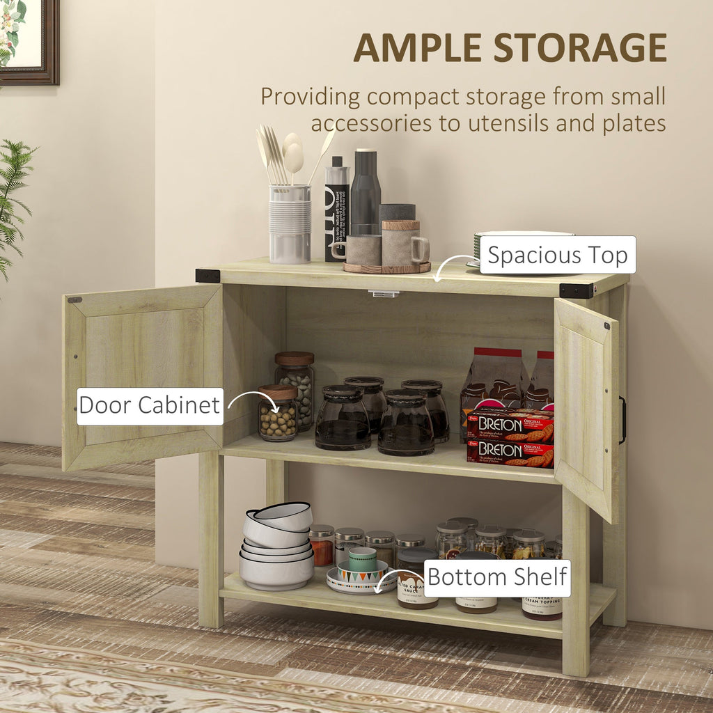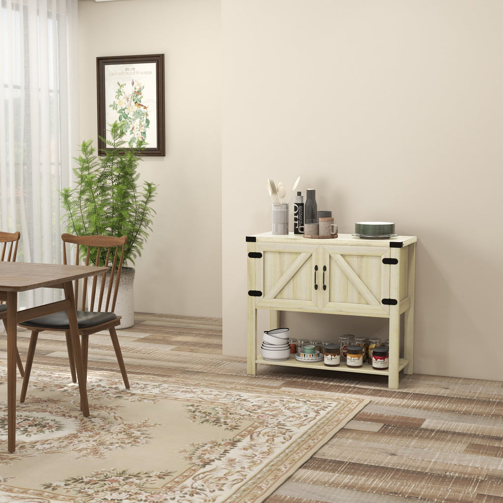 Bring farmhouse charm and practical storage to your home with this stylish buffet cabinet. Designed with a classic 2-door structure, this kitchen storage cabinet blends rustic aesthetics with modern functionality, offering ample space for organizing your essentials. Use the top surface to create an eye-catching display or keep serving dishes within easy reach, while the enclosed cabinet space provides a clutter-free solution for storing cooking utensils, dinnerware, or other household items. More than just a kitchen piece, this buffet table seamlessly fits into various spaces, serving as a coffee bar, dining room server, or even a TV console. The elevated base, supported by four sturdy wooden legs, not only enhances stability but also protects the cabinet from potential water damage. With overall dimensions of 35.4" W x 15.4" D x 31.7" H, this versatile credenza is a functional and stylish addition to any home setup.
