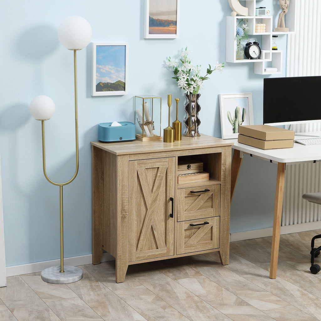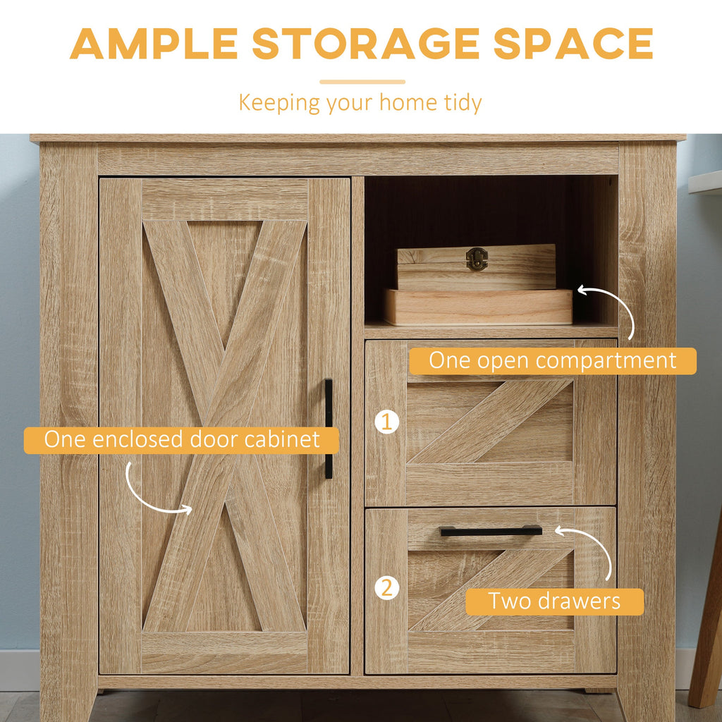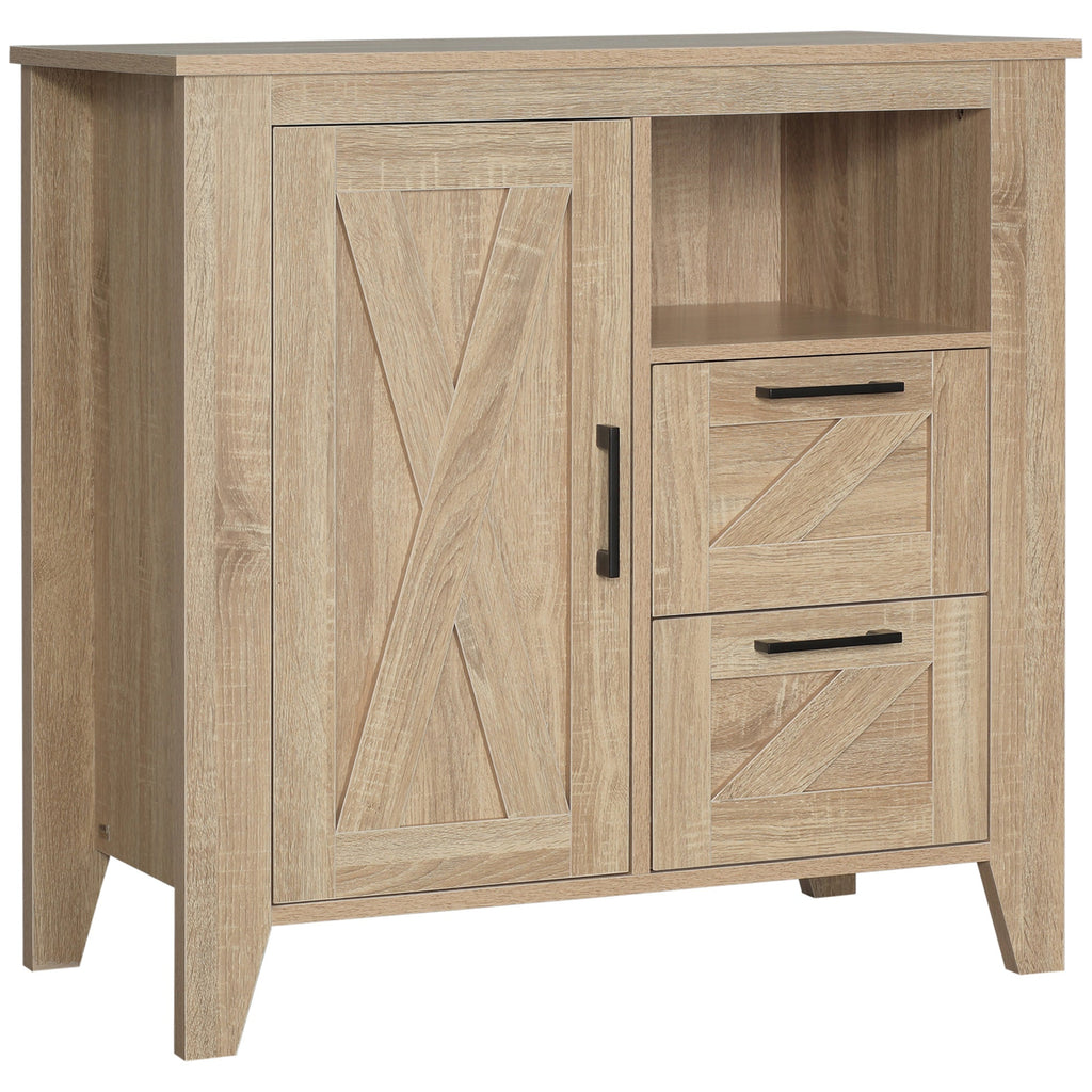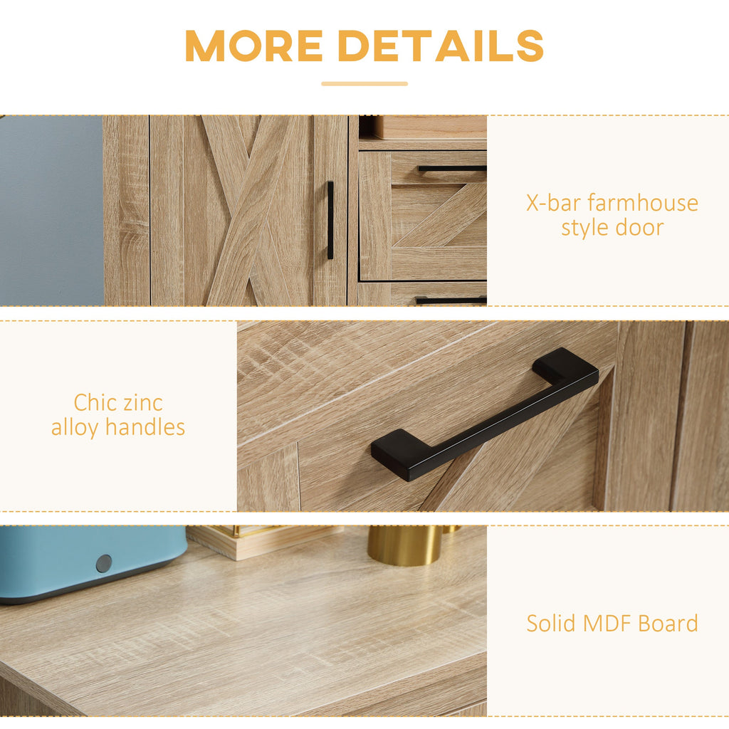 Bring a touch of farmhouse charm to your home with this Farmhouse Chic Buffet Cabinet. Featuring an X-bar design on the door and a natural wood finish, this storage cabinet blends rustic elegance with functional organization. Designed for versatility, it offers ample storage solutions with an enclosed cabinet, two drawers, two shelves, and an open compartment, making it perfect for storing kitchen essentials, dinnerware, or everyday accessories. The adjustable three-level shelf inside the left cupboard provides flexible storage options, allowing you to customize the space to fit your needs. Built from durable MDF, this cabinet ensures stability and longevity. For safety, an anti-tip strap secures the unit to the wall, making it a reliable choice for homes with children. Whether used as a buffet sideboard in the dining room, an accent cabinet in the living room, or a storage unit in the kitchen, this farmhouse-inspired piece is a stylish and practical addition to any home.