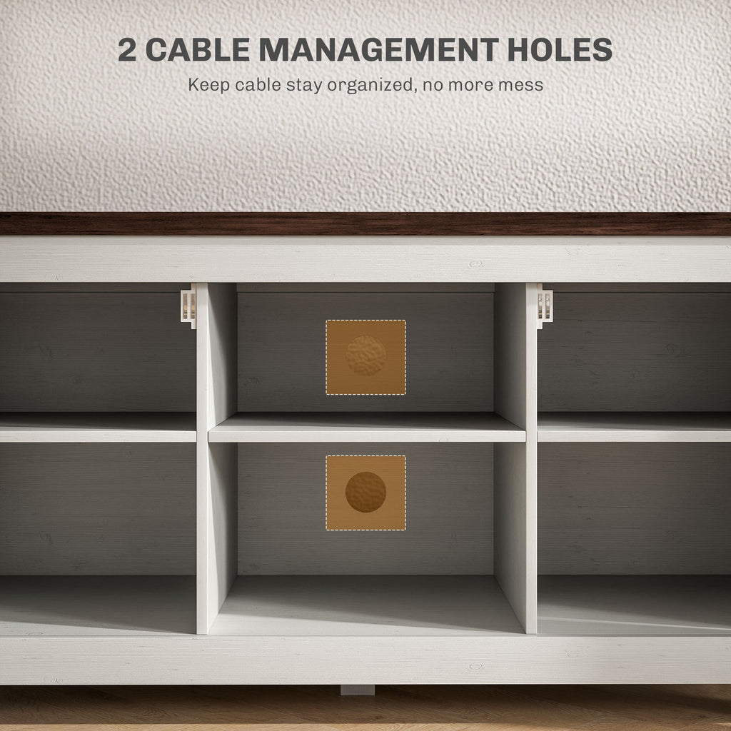 This stylish and functional TV cabinet is designed to accommodate up to 50" TVs, with a robust 1" (25 mm) thick tabletop and ample space measuring 43.3" (110 cm) in length. Built with five sturdy wood legs, the unit offers a weight capacity of 148 lbs (67 kg), ensuring it can support your entertainment needs. The cabinet brings farmhouse charm to your home with its rustic brown top, retro black metal accents, and two barn doors, making it a perfect addition to any living space. Offering ample storage, the TV bench includes two enclosed cabinets with three-level adjustable shelves and two open shelves, providing plenty of room for media devices, games, and other essentials. For a tidy and organized setup, the media unit features two cable holes and a backboard to help manage messy cords. Easy to assemble with a detailed manual and clearly marked parts, this media console is a practical and attractive solution for your living room or entertainment area. The overall dimensions are 43.3" W x 15.4" D x 21.7" H (110W x 39D x 55H cm).