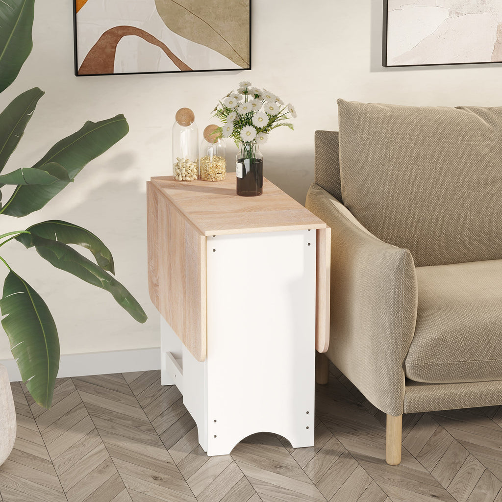 This versatile drop leaf table is the ultimate space-saving solution for any home. With a duo drop-leaf design, it can be used in three different ways, making it incredibly adaptable to your needs. When fully extended, it comfortably seats up to four people, making it perfect for family meals or intimate dinner parties. The table is also equipped with a bottom shelf, offering convenient and discreet storage for items you need within easy reach. Its clean white and oak color scheme brings a modern touch to any space, blending seamlessly with a variety of décor styles. Crafted from durable particleboard and finished with a smooth, protective melamine coating, this small kitchen table is easy to clean and built to last. Whether used in the kitchen, dining room, or even a small office, this folding table is both functional and beautiful, making it an excellent addition to any home.