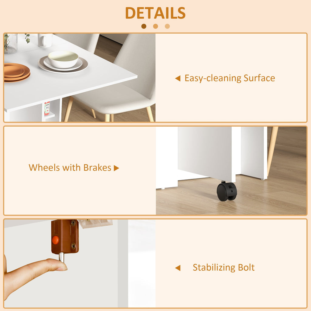 Perfect for small apartments or homes where space is at a premium, this foldable table offers a practical solution for both everyday dining and special occasions. Featuring two drop leaves, the large tabletop can comfortably seat up to six people, making it ideal for family meals or dinner parties. When not in use, simply fold it down to save valuable floor space. The table also includes built-in storage shelves, allowing you to neatly organize silverware, napkins, cups, side plates, and jars, so you can always find what you need without hassle. This versatile piece adapts to your needs, whether you're hosting a dinner party, working from home, or need extra workspace for any task. Constructed from solid particleboard with a melamine-coated finish, this table is designed for durability and easy maintenance. The alloy steel hinges and control pins provide stable support for each leaf, and the two rolling wheels ensure smooth folding and effortless movement. A truly functional addition to any home.