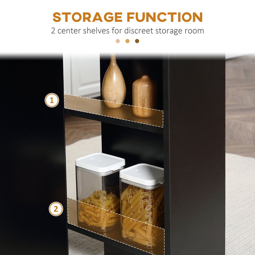 This modern drop-leaf table is the perfect solution for homes with limited space, offering a flexible and stylish design. With room for up to six people, the table extends easily as the side tabletops lift and stay securely in place. The two center shelves provide discreet storage for items, keeping them close at hand but out of sight when the table is fully extended. When the sides are lowered, these shelves are protected, adding extra functionality to the table. The sleek black finish of the table gives it a contemporary look, while the quality particleboard frame with a smooth melamine coating ensures easy cleaning and long-lasting durability. Equipped with two lockable wheels, this small dining table can be moved with ease and secured safely when in use. Whether you’re hosting a dinner party or just need extra storage, this table delivers on both style and practicality.