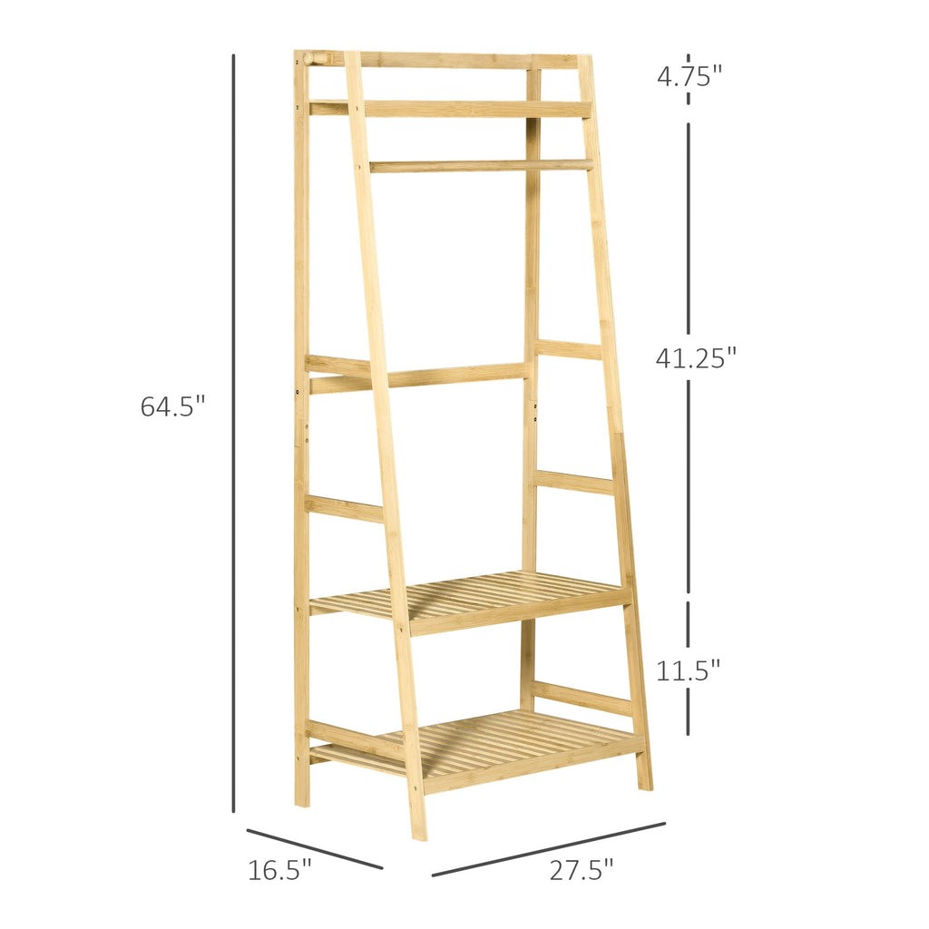 This sleek and functional coat rack is a perfect blend of minimalist design and practicality. The natural color finished wood frame exudes a simple, yet elegant style that seamlessly integrates into any room décor. With versatile storage options, it features 3 open shelves, 1 hanging rail, and 2 side hooks to accommodate clothes, bags, towels, and other accessories. Made from high-quality natural bamboo, this sturdy A-shaped coat rack is moisture-resistant, making it ideal for bathroom use. Its anti-tipping design adds extra safety, ensuring a secure setup. Compact and space-saving, it’s perfect for bedrooms, dorms, or hallways, offering a stylish solution for organization.