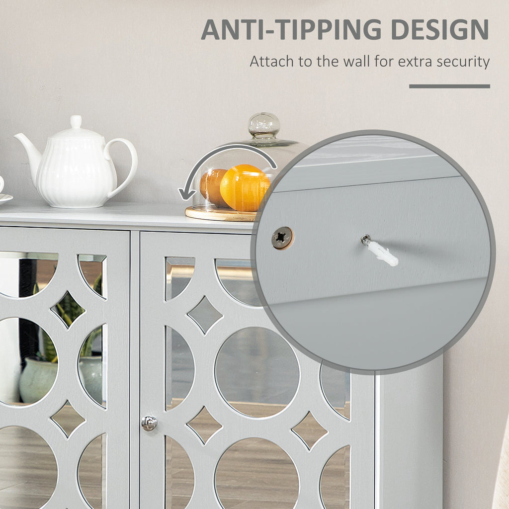Enhance your home with this elegant 3-door mirrored credenza, blending rustic charm with a chic, modern touch. The ornate mirror panels framed by a classic cut-out pattern create a sophisticated statement piece, perfect for dining areas, entryways, or living rooms. The three-door design offers ample concealed storage, keeping your space organized and clutter-free. Inside, two spacious cabinets with adjustable shelves provide the flexibility to store everything from cookware and utensils to decorative pieces and essentials. Whether used as a sideboard, bar cabinet, or hallway organizer, this versatile credenza is built for both style and function. Designed with anti-tipping straps for safety and a sturdy build, this storage cabinet ensures stability and durability for everyday use.