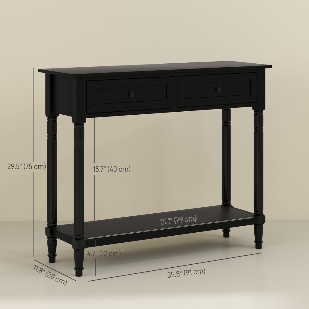 Enhance your home with this elegant console table, designed to bring a modern yet timeless touch to your space. Featuring a sleek solid color finish and classic turned legs, this sofa table blends seamlessly into entryways, hallways, or living rooms, complementing a variety of décor styles. With a spacious tabletop, two smooth-gliding drawers, and a lower shelf, it provides ample storage for everyday essentials and decorative items, keeping your space organized and stylish. Built from painted MDF, this hallway table is durable, easy to maintain, and resistant to daily wear and tear. An anti-tipping design ensures stability and safety, while the 4.7-inch clearance underneath allows for effortless cleaning. Whether used as an entryway table, sofa table, or decorative accent piece, this console table offers both functionality and elegance.