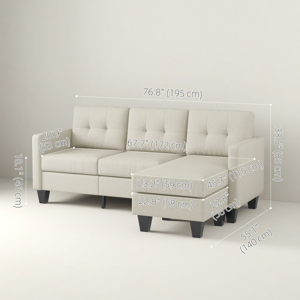 Enhance your living space with this stylish upholstered corner sofa set, designed to offer both elegance and comfort. Featuring a contemporary design with button detailing and breathable linen fabric, this sofa adds a modern touch to any room. The modular sectional layout includes a spacious three-seater design with a matching ottoman, providing versatile seating options. Use the ottoman to transform the sofa into a cozy lounger or as a footrest for added relaxation. High-density foam cushions deliver superior comfort, while the linen-touch polyester fabric ensures breathability and easy maintenance. Built with a sturdy solid wood frame and supported by durable rubber wood legs, this sofa set is designed for long-term use and supports up to 792 lbs. (360 kg). Assembly is quick and hassle-free, requiring just 20 minutes with 1-2 people.